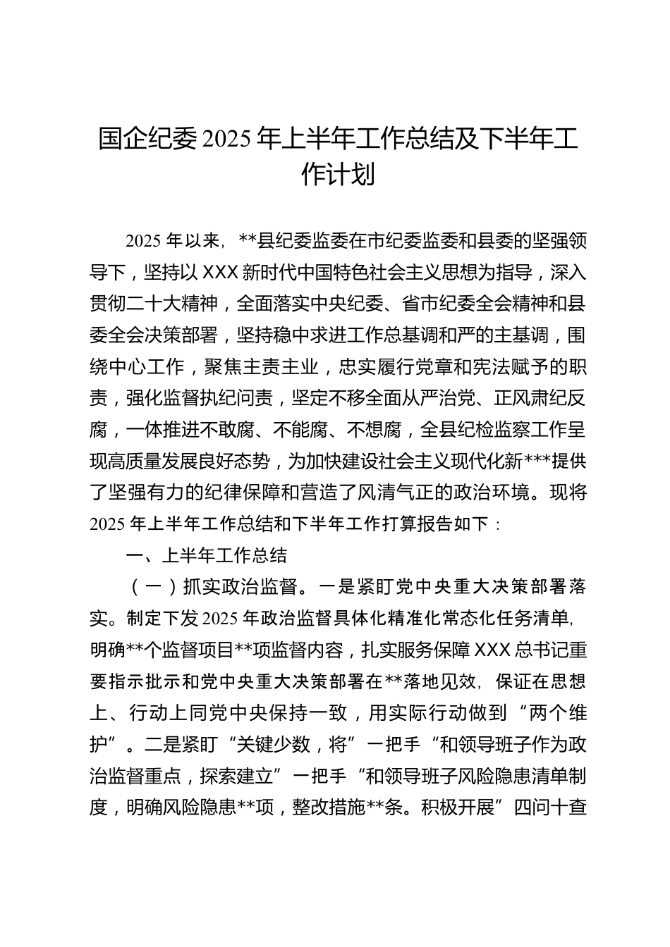 國(guó)企紀(jì)委2025年上半年工作總結(jié)及下半年工作計(jì)劃2025年以來(lái),**縣紀(jì)委監(jiān)委在市紀(jì)委監(jiān)委和縣委的堅(jiān)強(qiáng)領(lǐng)導(dǎo)下,堅(jiān)持以XXX新時(shí)代中國(guó)特色社會(huì)主義思想為指導(dǎo),深入貫徹二十大精神,全面落實(shí)中央紀(jì)委、省市紀(jì)委全會(huì)精神和縣委全會(huì)決策部署,堅(jiān)持穩(wěn)中求進(jìn)工作總基調(diào)和嚴(yán)的主基調(diào),圍繞中心工作,聚焦主責(zé)主業(yè),忠實(shí)履行黨章和憲法賦予的職責(zé),強(qiáng)化監(jiān)督執(zhí)紀(jì)問(wèn)責(zé),堅(jiān)定不移全面從嚴(yán)治黨、正風(fēng)肅紀(jì)反腐,一體推進(jìn)不敢腐、不能腐、不想腐,全縣紀(jì)檢監(jiān)察工作呈現(xiàn)高質(zhì)量發(fā)展良好態(tài)勢(shì),為加快建設(shè)社會(huì)主義現(xiàn)代化新***提供了堅(jiān)強(qiáng)有力的紀(jì)律保障和營(yíng)造了風(fēng)清氣正的政治環(huán)境?,F(xiàn)將2025年上...
