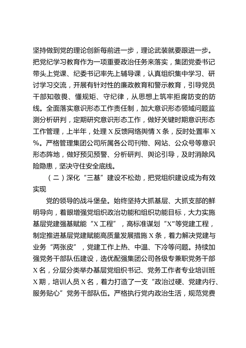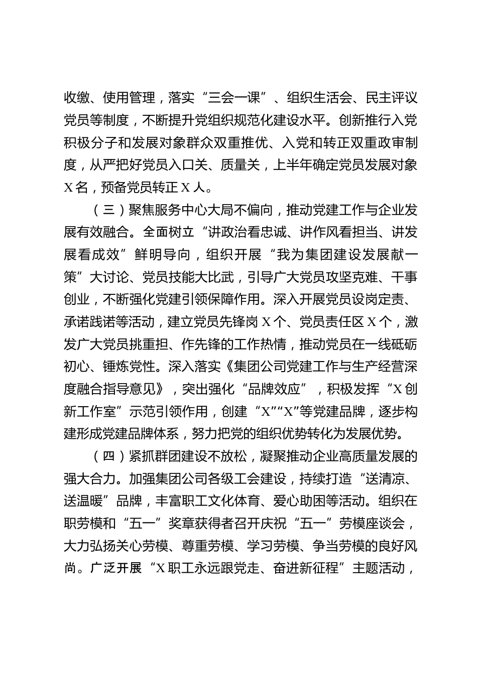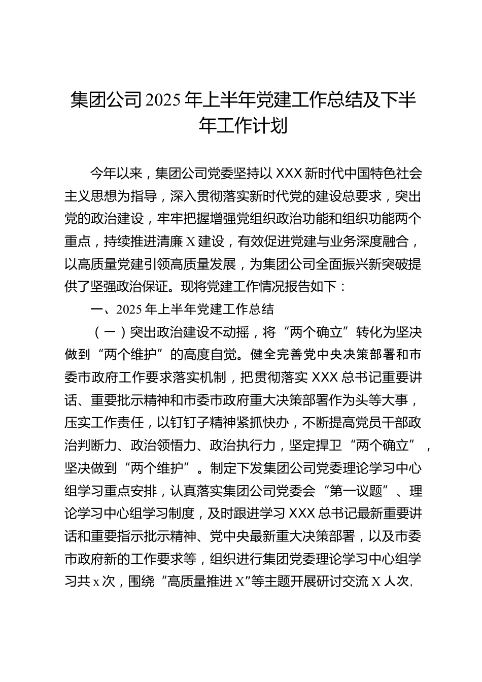 集團(tuán)公司2025年上半年黨建工作總結(jié)及下半年工作計(jì)劃今年以來,集團(tuán)公司黨委堅(jiān)持以XXX新時(shí)代中國特色社會(huì)主義思想為指導(dǎo),深入貫徹落實(shí)新時(shí)代黨的建設(shè)總要求,突出黨的政治建設(shè),牢牢把握增強(qiáng)黨組織政治功能和組織功能兩個(gè)重點(diǎn),持續(xù)推進(jìn)清廉X建設(shè),有效促進(jìn)黨建與業(yè)務(wù)深度融合,以高質(zhì)量黨建引領(lǐng)高質(zhì)量發(fā)展,為集團(tuán)公司全面振興新突破提供了堅(jiān)強(qiáng)政治保證。現(xiàn)將黨建工作情況報(bào)告如下:一、2025年上半年黨建工作總結(jié)(一)突出政治建設(shè)不動(dòng)搖,將“兩個(gè)確立”轉(zhuǎn)化為堅(jiān)決做到“兩個(gè)維護(hù)”的高度自覺。健全完善黨中央決策部署和市委市政府工作要求落實(shí)機(jī)制,把貫徹落實(shí)XXX總...