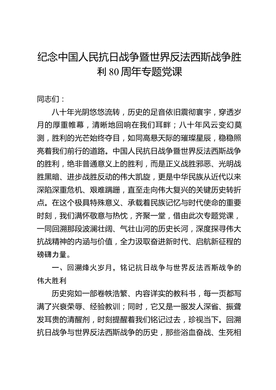 紀念中國人民抗日戰(zhàn)爭暨世界反法西斯戰(zhàn)爭勝利80周年專題黨課同志們:八十年光陰悠悠流轉(zhuǎn),歷史的足音依舊震徹寰宇,穿透歲月的厚重帷幕,清晰地回響在我們耳畔;八十年風(fēng)云變幻莫測,勝利的光芒始終奪目,如同高懸天際的璀璨星辰,穩(wěn)穩(wěn)照亮著我們前行的道路。中國人民抗日戰(zhàn)爭暨世界反法西斯戰(zhàn)爭的勝利,絕非普通意義上的勝利,而是正義戰(zhàn)勝邪惡、光明戰(zhàn)勝黑暗、進步戰(zhàn)勝反動的偉大凱旋,更是中華民族從近代以來深陷深重危機、艱難蹣跚,直至走向偉大復(fù)興的關(guān)鍵歷史轉(zhuǎn)折點。在這個極具特殊意義、承載著民族記憶與時代使命的重要時刻,我們滿懷敬意與熱忱,齊聚一堂,借由...