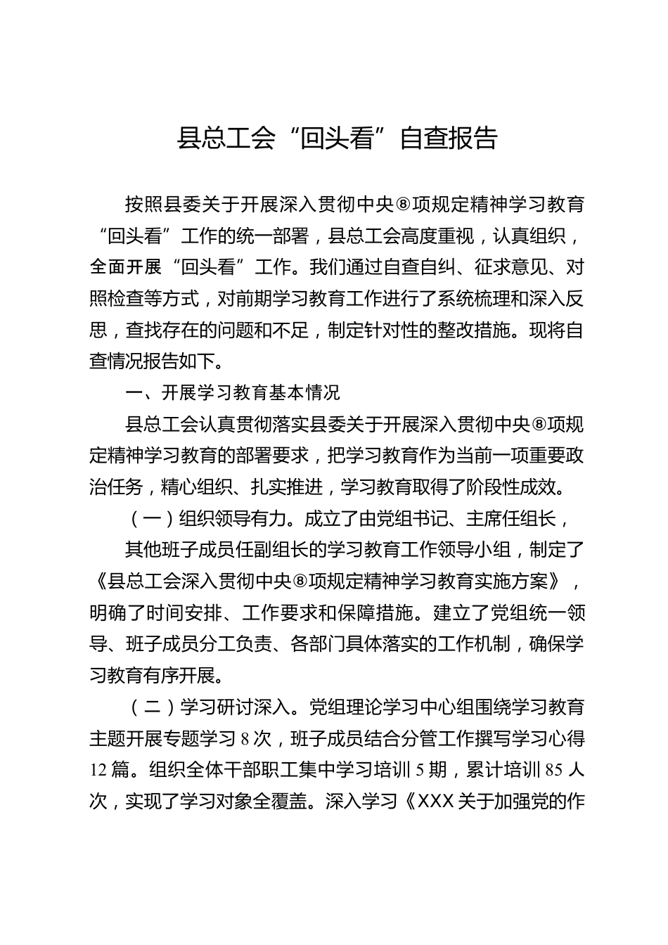 縣總工會“回頭看”自查報告按照縣委關于開展深入貫徹中央⑧項規(guī)定精神學習教育“回頭看”工作的統(tǒng)一部署,縣總工會高度重視,認真組織,全面開展“回頭看”工作。我們通過自查自糾、征求意見、對照檢查等方式,對前期學習教育工作進行了系統(tǒng)梳理和深入反思,查找存在的問題和不足,制定針對性的整改措施?,F(xiàn)將自查情況報告如下。一、開展學習教育基本情況縣總工會認真貫徹落實縣委關于開展深入貫徹中央⑧項規(guī)定精神學習教育的部署要求,把學習教育作為當前一項重要政治任務,精心組織、扎實推進,學習教育取得了階段性成效。(一)組織領導有力。成立了由黨組書記、主席...