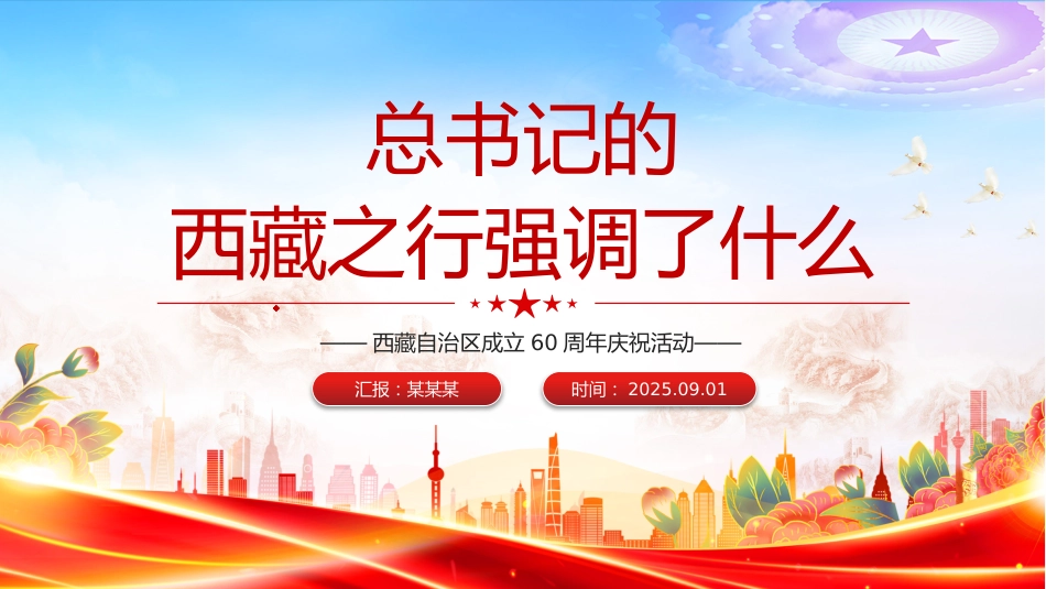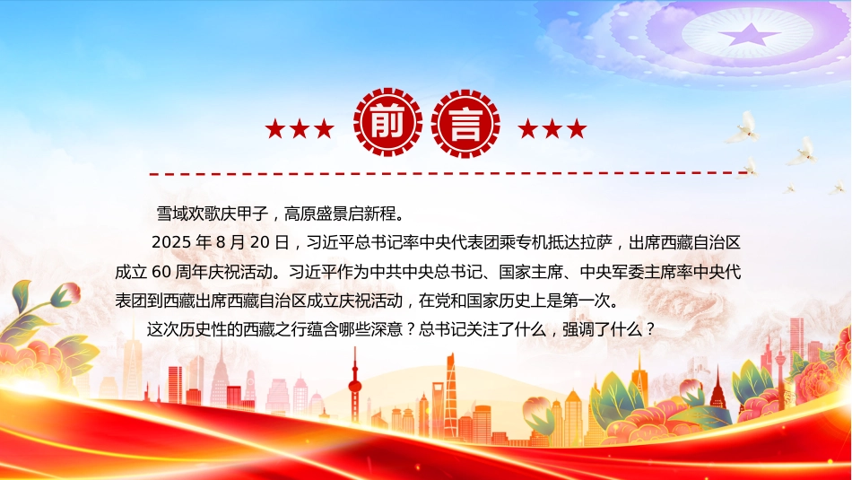 總書記的西藏之行強(qiáng)調(diào)了什么匯報(bào):某某某時(shí)間:2025.09.01——西藏自治區(qū)成立60周年慶?;顒?dòng)——雪域歡歌慶甲子,高原盛景啟新程。2025年8月20日,習(xí)近平總書記率中央代表團(tuán)乘專機(jī)抵達(dá)拉薩,出席西藏自治區(qū)成立60周年慶?;顒?dòng)。習(xí)近平作為中共中央總書記、國家主席、中央軍委主席率中央代表團(tuán)到西藏出席西藏自治區(qū)成立慶?;顒?dòng),在黨和國家歷史上是第一次。這次歷史性的西藏之行蘊(yùn)含哪些深意?總書記關(guān)注了什么,強(qiáng)調(diào)了什么?前言目錄1意義非凡的西藏之行2雪域高原的盛情迎接3關(guān)鍵節(jié)點(diǎn)的重要指引第一章節(jié)意義非凡的西藏之行這是習(xí)近平總書記時(shí)隔四年,再次踏上祖國西南這...