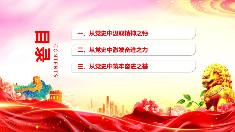 黨史銘志奮斗復(fù)興授課人:某某某時間:2025.09.01中國共產(chǎn)黨成立伊始,就把實現(xiàn)共產(chǎn)主義作為黨的最高理想和最終目標(biāo),義無反顧肩負(fù)起實現(xiàn)中華民族偉大復(fù)興的歷史使命,團(tuán)結(jié)帶領(lǐng)人民進(jìn)行了艱苦卓絕的斗爭,譜寫了氣吞山河的壯麗史詩。目錄CONTENTS一、從黨史中汲取精神之鈣二、從黨史中激發(fā)奮進(jìn)之力三、從黨史中筑牢奮進(jìn)之基從黨史中汲取精神之鈣[第一部分]一、從黨史中汲取精神之鈣黨員思想教育黨史蘊(yùn)含著我們黨先進(jìn)的政治屬性、崇高的政治理想、純潔的政治品質(zhì),這些都是紅色基因的重要組成部分,是取之不盡的“鈣”之源、精神力量之源,黨員要善于從黨史中汲取精神上的...