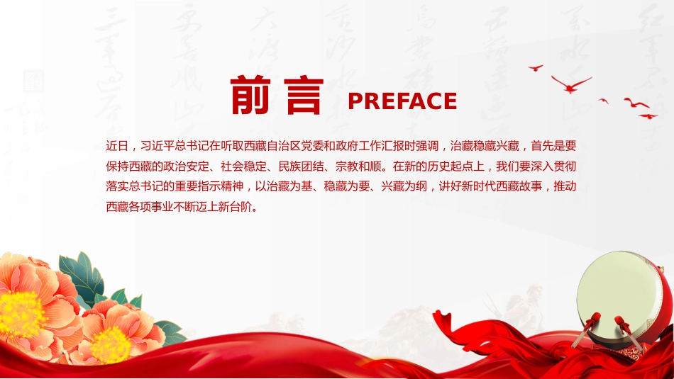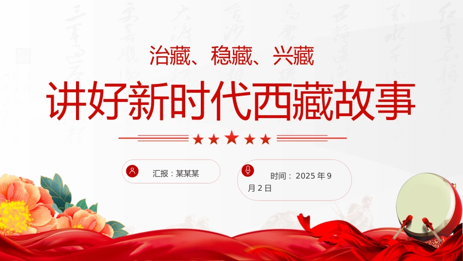治藏、穩(wěn)藏、興藏講好新時(shí)代西藏故事匯報(bào):某某某時(shí)間:2025年9月2日近日,習(xí)近平總書記在聽(tīng)取西藏自治區(qū)黨委和政府工作匯報(bào)時(shí)強(qiáng)調(diào),治藏穩(wěn)藏興藏,首先是要保持西藏的政治安定、社會(huì)穩(wěn)定、民族團(tuán)結(jié)、宗教和順。在新的歷史起點(diǎn)上,我們要深入貫徹落實(shí)總書記的重要指示精神,以治藏為基、穩(wěn)藏為要、興藏為綱,講好新時(shí)代西藏故事,推動(dòng)西藏各項(xiàng)事業(yè)不斷邁上新臺(tái)階。前言PREFACE治藏、穩(wěn)藏、興藏——講好新時(shí)代西藏故事治藏為基,筑牢長(zhǎng)治久安根本。治藏,是一項(xiàng)系統(tǒng)而復(fù)雜的工程,需要從政治、經(jīng)濟(jì)、文化、社會(huì)等多個(gè)層面協(xié)同推進(jìn)。首先,要加強(qiáng)黨的領(lǐng)導(dǎo),強(qiáng)化黨建引領(lǐng)。...
