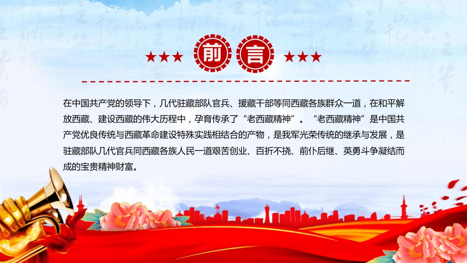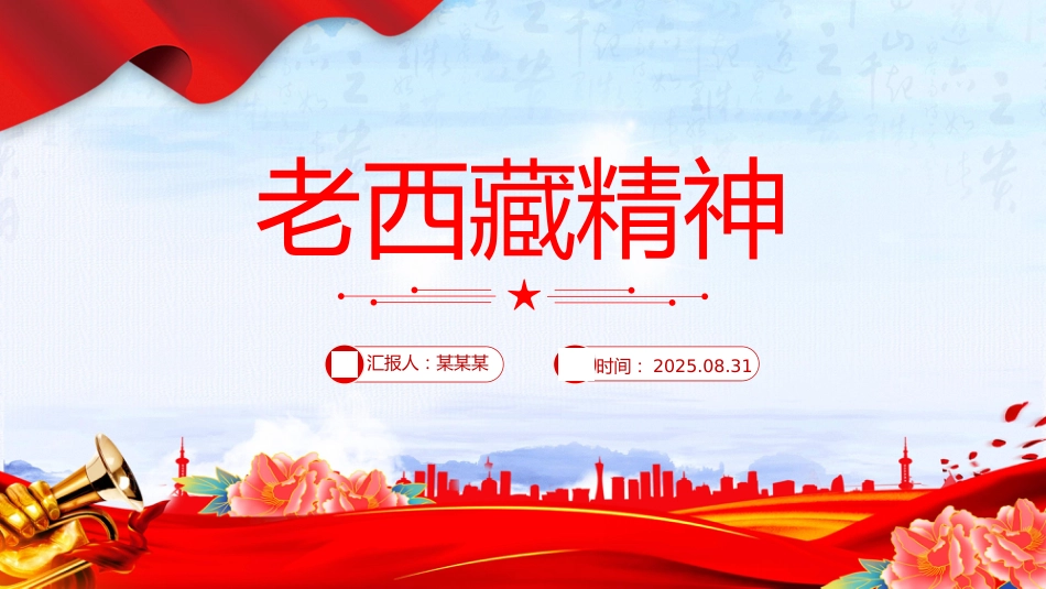 匯報人:某某某時間:2025.08.31老西藏精神在中國共產(chǎn)黨的領導下,幾代駐藏部隊官兵、援藏干部等同西藏各族群眾一道,在和平解放西藏、建設西藏的偉大歷程中,孕育傳承了“老西藏精神”?!袄衔鞑鼐瘛笔侵袊伯a(chǎn)黨優(yōu)良傳統(tǒng)與西藏革命建設特殊實踐相結合的產(chǎn)物,是我軍光榮傳統(tǒng)的繼承與發(fā)展,是駐藏部隊幾代官兵同西藏各族人民一道艱苦創(chuàng)業(yè)、百折不撓、前仆后繼、英勇斗爭凝結而成的寶貴精神財富。前言老西藏精神2020年8月,在中央第七次西藏工作座談會上,習近平總書記指出:廣大干部特別是西藏干部要發(fā)揚“老西藏精神”,缺氧不缺精神、艱苦不怕吃苦、海拔高境界更高...