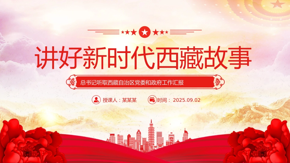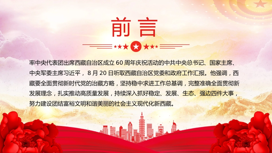 不忘初心黨政黨建工作匯報認真學習、貫徹和領(lǐng)會上級各項方針、政策、法規(guī);維護黨的團結(jié)和統(tǒng)一,對黨忠誠老實,言行一致;密切聯(lián)系群眾,向群眾宣傳黨的主張,遇事同群眾商量不忘初心黨政黨建工作匯報認真學習、貫徹和領(lǐng)會上級各項方針、政策、法規(guī);維護黨的團結(jié)和統(tǒng)一,對黨忠誠老實,言行一致;密切聯(lián)系群眾,向群眾宣傳黨的主張,遇事同群眾商量講好新時代西藏故事授課人:某某某時間:2025.09.02總書記聽取西藏自治區(qū)黨委和政府工作匯報不忘初心黨政黨建工作匯報認真學習、貫徹和領(lǐng)會上級各項方針、政策、法規(guī);維護黨的團結(jié)和統(tǒng)一,對黨忠誠老實,言行一致;密切聯(lián)...