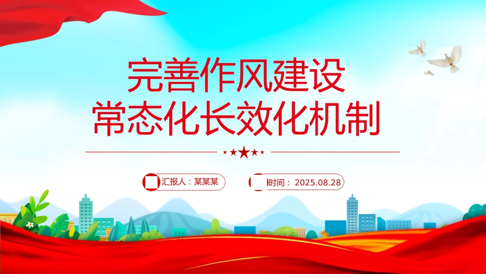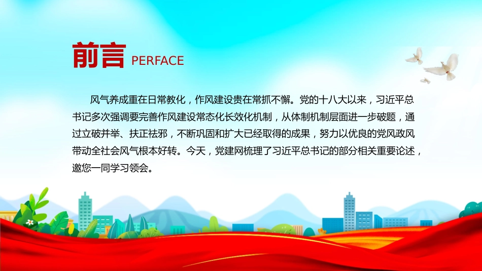 匯報(bào)人:某某某時(shí)間:2025.08.28完善作風(fēng)建設(shè)常態(tài)化長效化機(jī)制風(fēng)氣養(yǎng)成重在日常教化,作風(fēng)建設(shè)貴在常抓不懈。黨的十八大以來,習(xí)近平總書記多次強(qiáng)調(diào)要完善作風(fēng)建設(shè)常態(tài)化長效化機(jī)制,從體制機(jī)制層面進(jìn)一步破題,通過立破并舉、扶正祛邪,不斷鞏固和擴(kuò)大已經(jīng)取得的成果,努力以優(yōu)良的黨風(fēng)政風(fēng)帶動(dòng)全社會(huì)風(fēng)氣根本好轉(zhuǎn)。今天,黨建網(wǎng)梳理了習(xí)近平總書記的部分相關(guān)重要論述,邀您一同學(xué)習(xí)領(lǐng)會(huì)。前言PERFACE01作風(fēng)建設(shè)永遠(yuǎn)在路上,必須常抓不懈02在改進(jìn)作風(fēng)問題上,必須保持常抓的韌勁、長抓的耐心03堅(jiān)持黨性黨風(fēng)黨紀(jì)一起抓、正風(fēng)肅紀(jì)反腐相貫通,推進(jìn)作風(fēng)建設(shè)常態(tài)化長效化目...