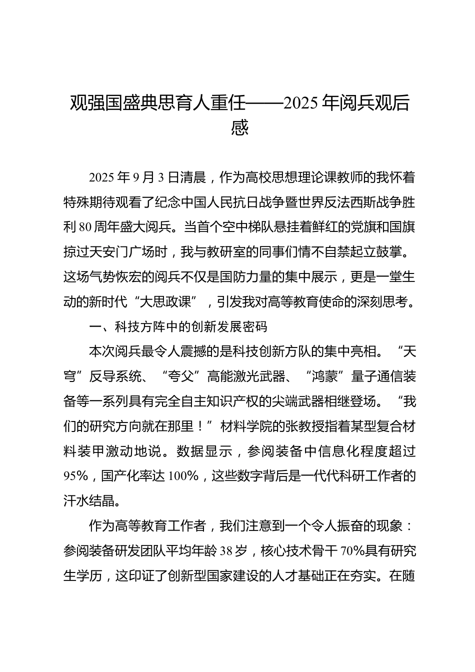 觀強(qiáng)國盛典思育人重任——2025年閱兵觀后感2025年9月3日清晨,作為高校思想理論課教師的我懷著特殊期待觀看了紀(jì)念中國人民抗日戰(zhàn)爭暨世界反法西斯戰(zhàn)爭勝利80周年盛大閱兵。當(dāng)首個空中梯隊?wèi)覓熘r紅的黨旗和國旗掠過天安門廣場時,我與教研室的同事們情不自禁起立鼓掌。這場氣勢恢宏的閱兵不僅是國防力量的集中展示,更是一堂生動的新時代“大思政課”,引發(fā)我對高等教育使命的深刻思考。一、科技方陣中的創(chuàng)新發(fā)展密碼本次閱兵最令人震撼的是科技創(chuàng)新方隊的集中亮相。“天穹”反導(dǎo)系統(tǒng)、“夸父”高能激光武器、“鴻蒙”量子通信裝備等一系列具有完全自主知識產(chǎn)權(quán)的尖端武...