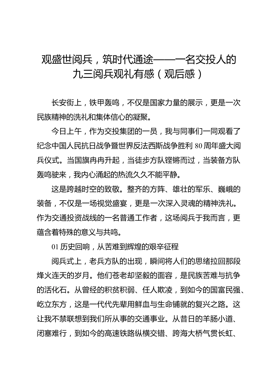 觀盛世閱兵,筑時代通途——一名交投人的九三閱兵觀禮有感(觀后感)長安街上,鐵甲轟鳴,不僅是國家力量的展示,更是一次民族精神的洗禮和集體信心的凝聚。今日上午,作為交投集團的一員,我與同事們一同觀看了紀念中國人民抗日戰(zhàn)爭暨世界反法西斯戰(zhàn)爭勝利80周年盛大閱兵儀式。當國旗冉冉升起,當徒步方隊鏗鏘而過,當裝備方隊轟鳴駛來,我內(nèi)心涌起的熱流久久不能平靜。這是跨越時空的致敬。整齊的方陣、雄壯的軍樂、巍峨的裝備,不僅是一場視覺盛宴,更是一次深入靈魂的精神洗禮。作為交通投資戰(zhàn)線的一名普通工作者,這場閱兵于我而言,更蘊含著特殊的意義與共鳴。01歷...