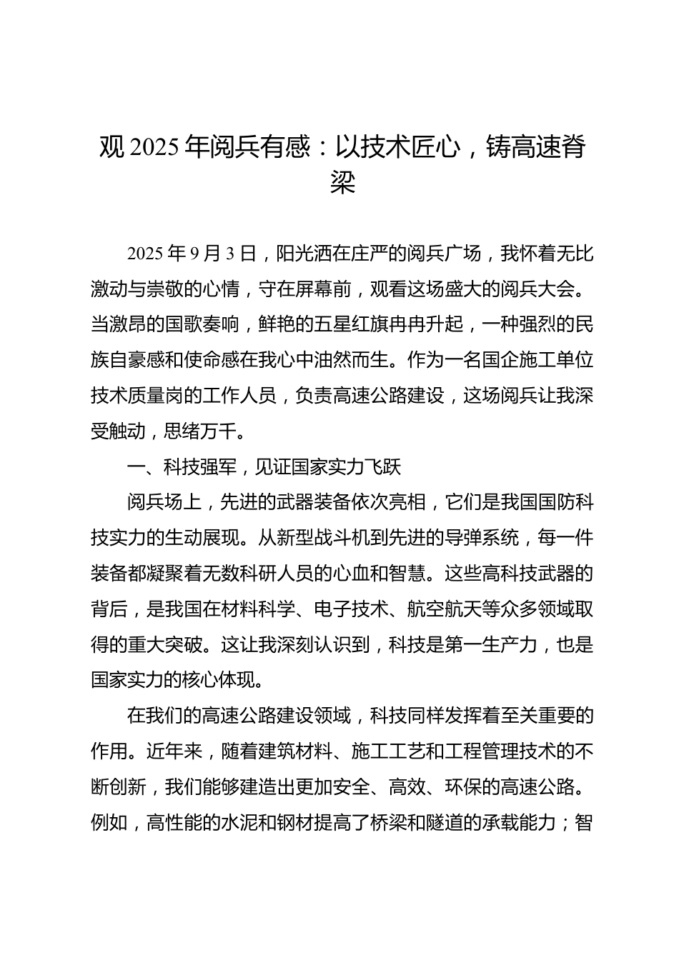 觀2025年閱兵有感:以技術(shù)匠心,鑄高速脊梁2025年9月3日,陽光灑在莊嚴的閱兵廣場,我懷著無比激動與崇敬的心情,守在屏幕前,觀看這場盛大的閱兵大會。當激昂的國歌奏響,鮮艷的五星紅旗冉冉升起,一種強烈的民族自豪感和使命感在我心中油然而生。作為一名國企施工單位技術(shù)質(zhì)量崗的工作人員,負責高速公路建設(shè),這場閱兵讓我深受觸動,思緒萬千。一、科技強軍,見證國家實力飛躍閱兵場上,先進的武器裝備依次亮相,它們是我國國防科技實力的生動展現(xiàn)。從新型戰(zhàn)斗機到先進的導彈系統(tǒng),每一件裝備都凝聚著無數(shù)科研人員的心血和智慧。這些高科技武器的背后,是我國在材料科...
