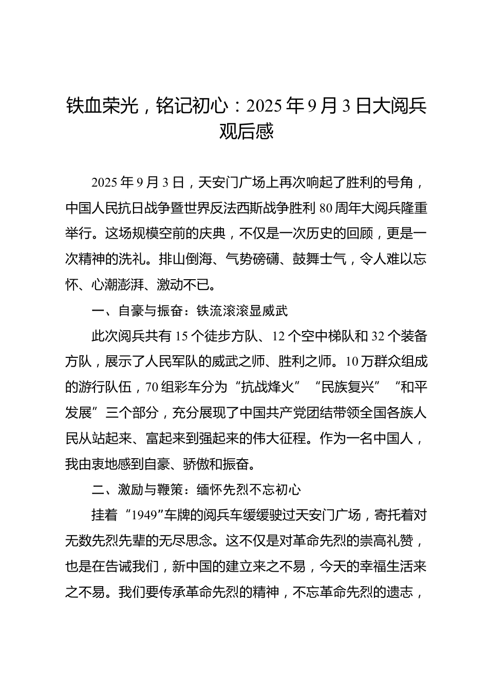 鐵血榮光,銘記初心:2025年9月3日大閱兵觀后感2025年9月3日,天安門廣場(chǎng)上再次響起了勝利的號(hào)角,中國(guó)人民抗日戰(zhàn)爭(zhēng)暨世界反法西斯戰(zhàn)爭(zhēng)勝利80周年大閱兵隆重舉行。這場(chǎng)規(guī)??涨暗膽c典,不僅是一次歷史的回顧,更是一次精神的洗禮。排山倒海、氣勢(shì)磅礴、鼓舞士氣,令人難以忘懷、心潮澎湃、激動(dòng)不已。一、自豪與振奮:鐵流滾滾顯威武此次閱兵共有15個(gè)徒步方隊(duì)、12個(gè)空中梯隊(duì)和32個(gè)裝備方隊(duì),展示了人民軍隊(duì)的威武之師、勝利之師。10萬(wàn)群眾組成的游行隊(duì)伍,70組彩車分為“抗戰(zhàn)烽火”“民族復(fù)興”“和平發(fā)展”三個(gè)部分,充分展現(xiàn)了中國(guó)共產(chǎn)黨團(tuán)結(jié)帶領(lǐng)全國(guó)各族人民從站起來(lái)、...