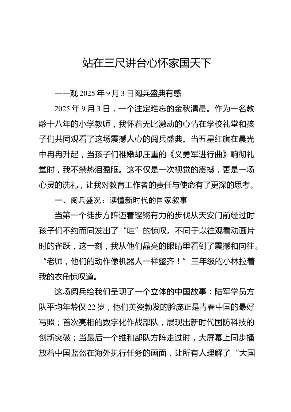 站在三尺講臺心懷家國天下——觀2025年9月3日閱兵盛典有感2025年9月3日,一個注定難忘的金秋清晨。作為一名教齡十八年的小學(xué)教師,我懷著無比激動的心情在學(xué)校禮堂和孩子們共同觀看了這場震撼人心的閱兵盛典。當(dāng)五星紅旗在晨光中冉冉升起,當(dāng)孩子們稚嫩卻莊重的《義勇軍進(jìn)行曲》響徹禮堂時,我不禁熱淚盈眶。這不僅是一次視覺的震撼,更是一場心靈的洗禮,讓我對教育工作者的責(zé)任與使命有了更深的思考。一、閱兵盛況:讀懂新時代的國家敘事當(dāng)?shù)谝粋€徒步方陣邁著鏗鏘有力的步伐從天安門前經(jīng)過時孩子們不約而同發(fā)出了“哇”的驚嘆。不同于以往觀看動畫片時的雀躍,這一刻,...