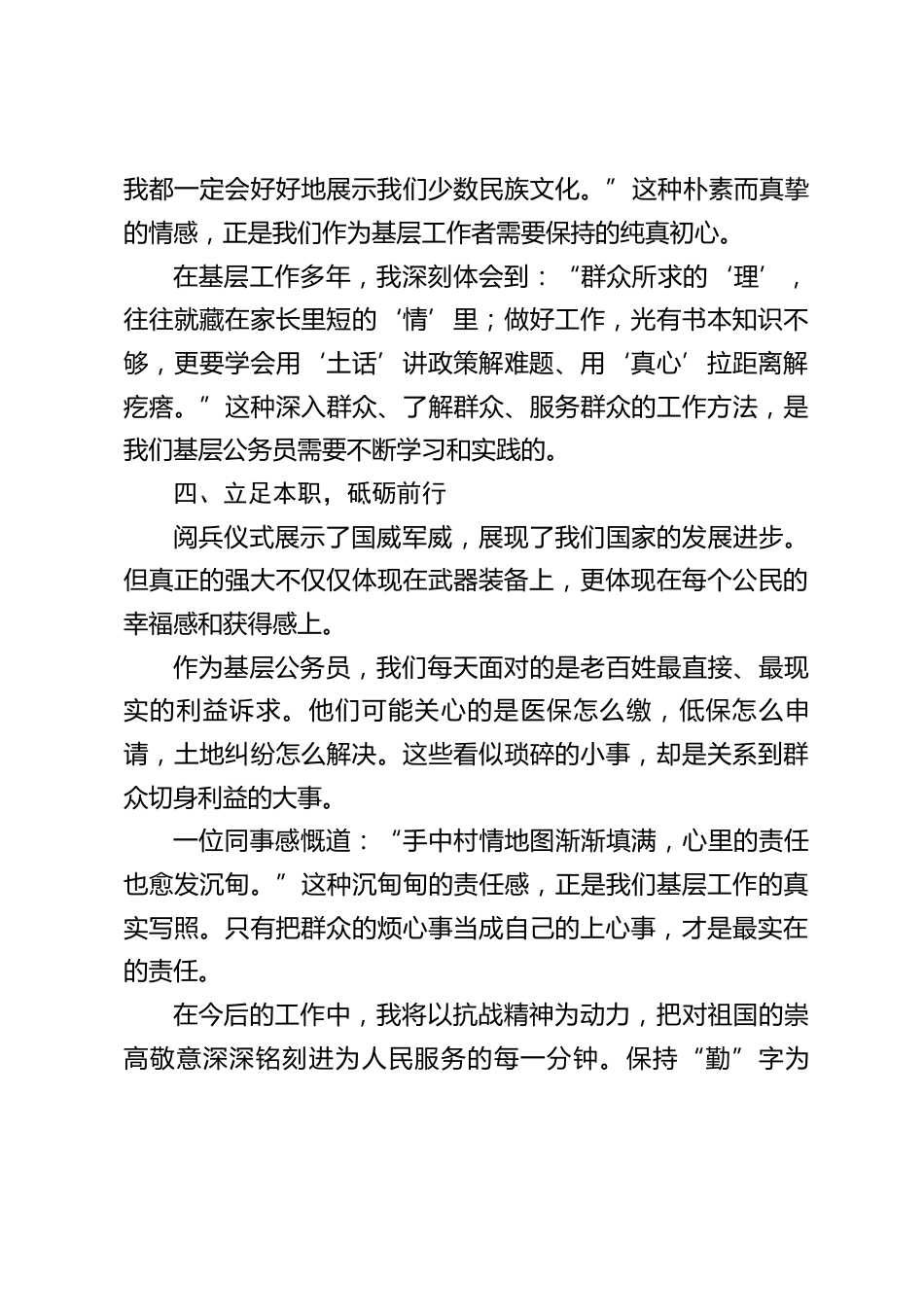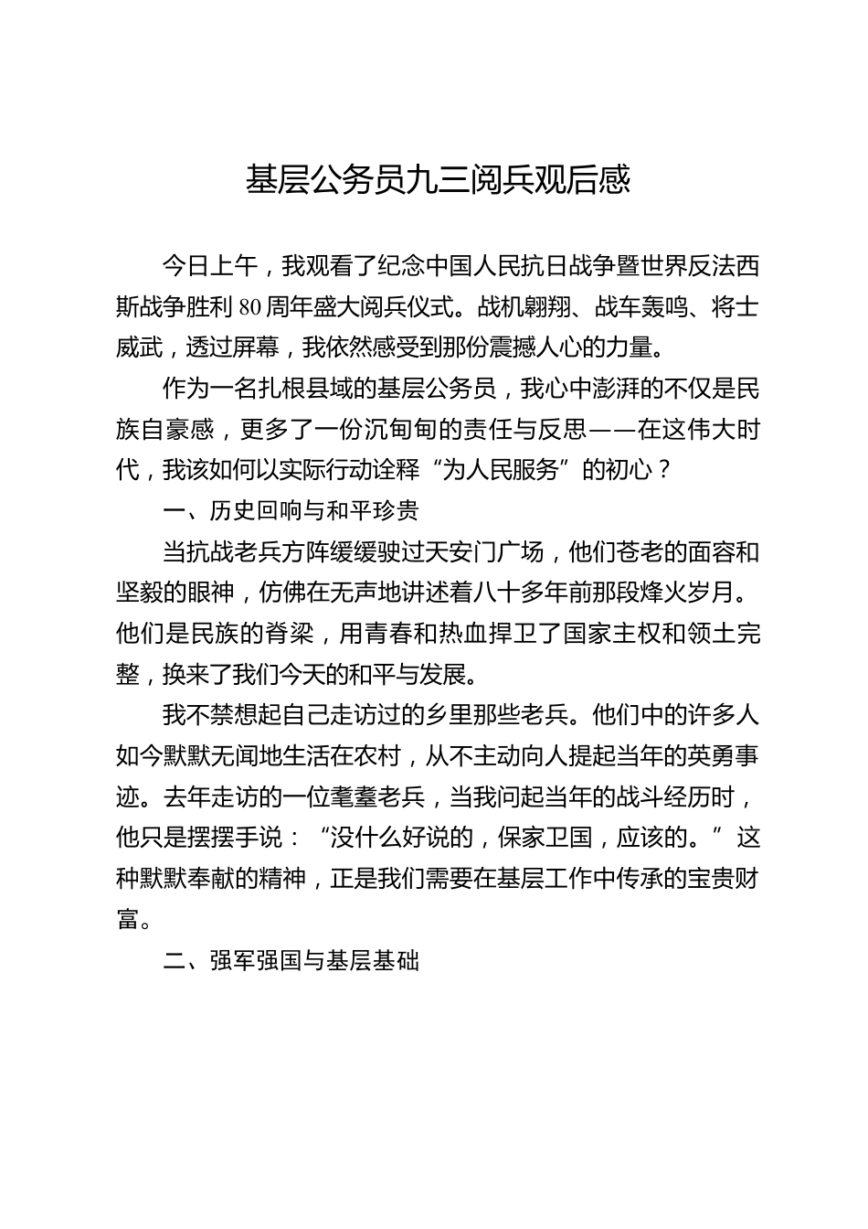 基層公務員九三閱兵觀后感今日上午,我觀看了紀念中國人民抗日戰(zhàn)爭暨世界反法西斯戰(zhàn)爭勝利80周年盛大閱兵儀式。戰(zhàn)機翱翔、戰(zhàn)車轟鳴、將士威武,透過屏幕,我依然感受到那份震撼人心的力量。作為一名扎根縣域的基層公務員,我心中澎湃的不僅是民族自豪感,更多了一份沉甸甸的責任與反思——在這偉大時代,我該如何以實際行動詮釋“為人民服務”的初心?一、歷史回響與和平珍貴當抗戰(zhàn)老兵方陣緩緩駛過天安門廣場,他們蒼老的面容和堅毅的眼神,仿佛在無聲地講述著八十多年前那段烽火歲月。他們是民族的脊梁,用青春和熱血捍衛(wèi)了國家主權和領土完整,換來了我們今天的和平與...