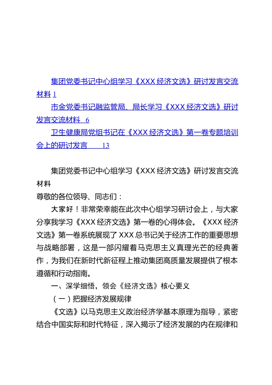 集團(tuán)黨委書記中心組學(xué)習(xí)《XXX經(jīng)濟(jì)文選》研討發(fā)言交流材料1市金黨委書記融監(jiān)管局、局長學(xué)習(xí)《XXX經(jīng)濟(jì)文選》研討發(fā)言交流材料6衛(wèi)生健康局黨組書記在《XXX經(jīng)濟(jì)文選》第一卷專題培訓(xùn)會上的研討發(fā)言13集團(tuán)黨委書記中心組學(xué)習(xí)《XXX經(jīng)濟(jì)文選》研討發(fā)言交流材料尊敬的各位領(lǐng)導(dǎo)、同志們:大家好!非常榮幸能在此次中心組學(xué)習(xí)研討會上,與大家分享我學(xué)習(xí)《XXX經(jīng)濟(jì)文選》第一卷的心得體會。《XXX經(jīng)濟(jì)文選》第一卷系統(tǒng)展現(xiàn)了XXX總書記關(guān)于經(jīng)濟(jì)工作的重要思想與戰(zhàn)略部署,這是一部閃耀著馬克思主義真理光芒的經(jīng)典著作,為我們在新時代新征程上推動集團(tuán)高質(zhì)量發(fā)展提供了根本遵循和行動...
