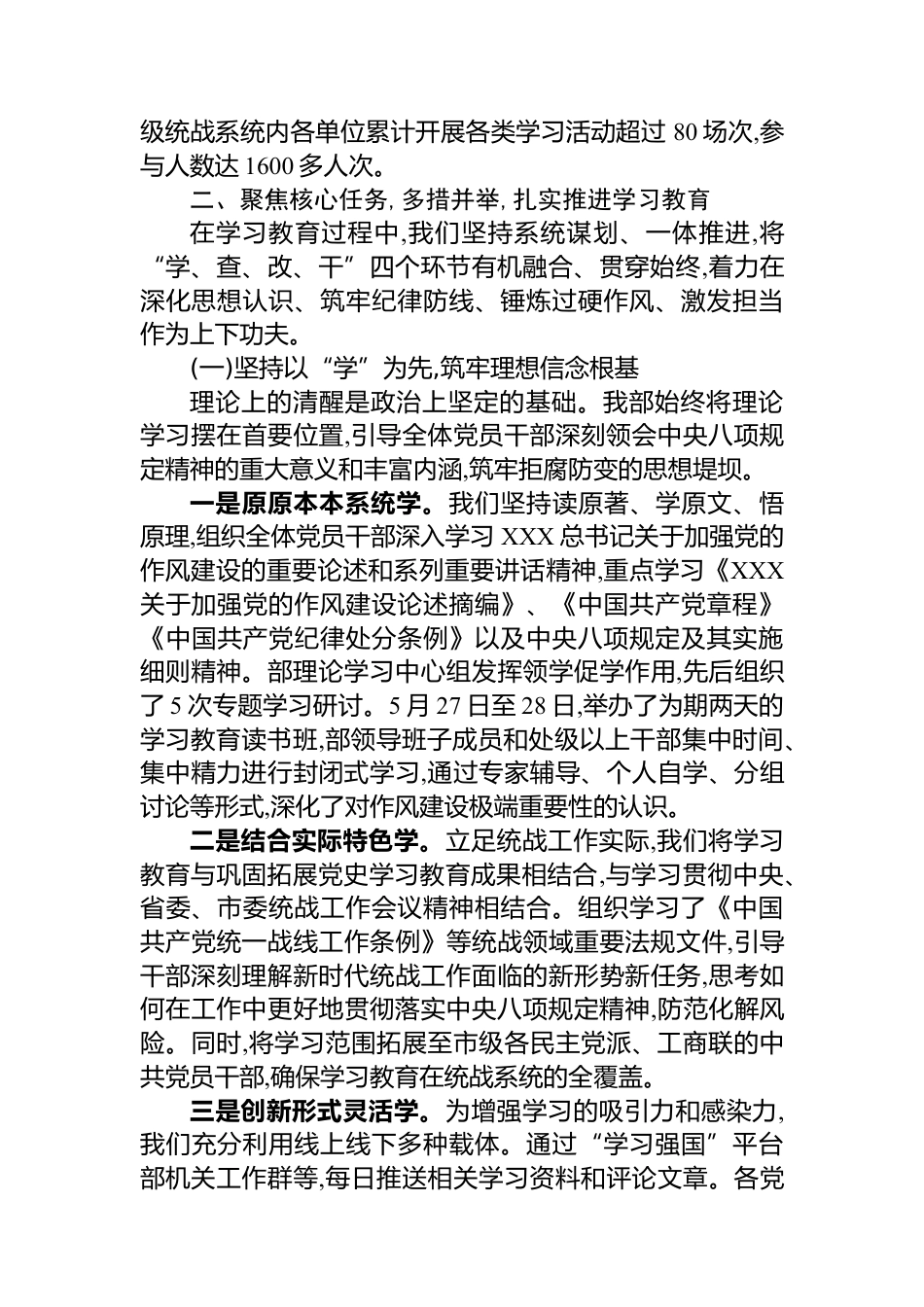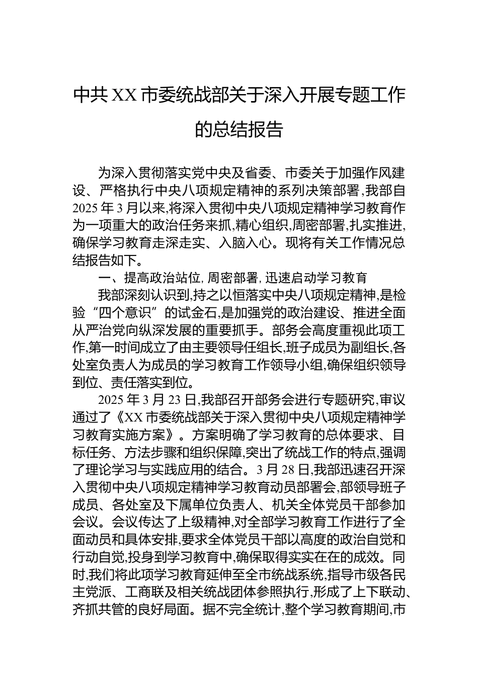 中共XX市委統(tǒng)戰(zhàn)部關(guān)于深入開(kāi)展專題工作的總結(jié)報(bào)告為深入貫徹落實(shí)黨中央及省委、市委關(guān)于加強(qiáng)作風(fēng)建設(shè)、嚴(yán)格執(zhí)行中央八項(xiàng)規(guī)定精神的系列決策部署,我部自2025年3月以來(lái),將深入貫徹中央八項(xiàng)規(guī)定精神學(xué)習(xí)教育作為一項(xiàng)重大的政治任務(wù)來(lái)抓,精心組織,周密部署,扎實(shí)推進(jìn),確保學(xué)習(xí)教育走深走實(shí)、入腦入心。現(xiàn)將有關(guān)工作情況總結(jié)報(bào)告如下。一、提高政治站位,周密部署,迅速啟動(dòng)學(xué)習(xí)教育我部深刻認(rèn)識(shí)到,持之以恒落實(shí)中央八項(xiàng)規(guī)定精神,是檢驗(yàn)“四個(gè)意識(shí)”的試金石,是加強(qiáng)黨的政治建設(shè)、推進(jìn)全面從嚴(yán)治黨向縱深發(fā)展的重要抓手。部務(wù)會(huì)高度重視此項(xiàng)工作,第一時(shí)間成立了由主要領(lǐng)導(dǎo)任組長(zhǎng),...