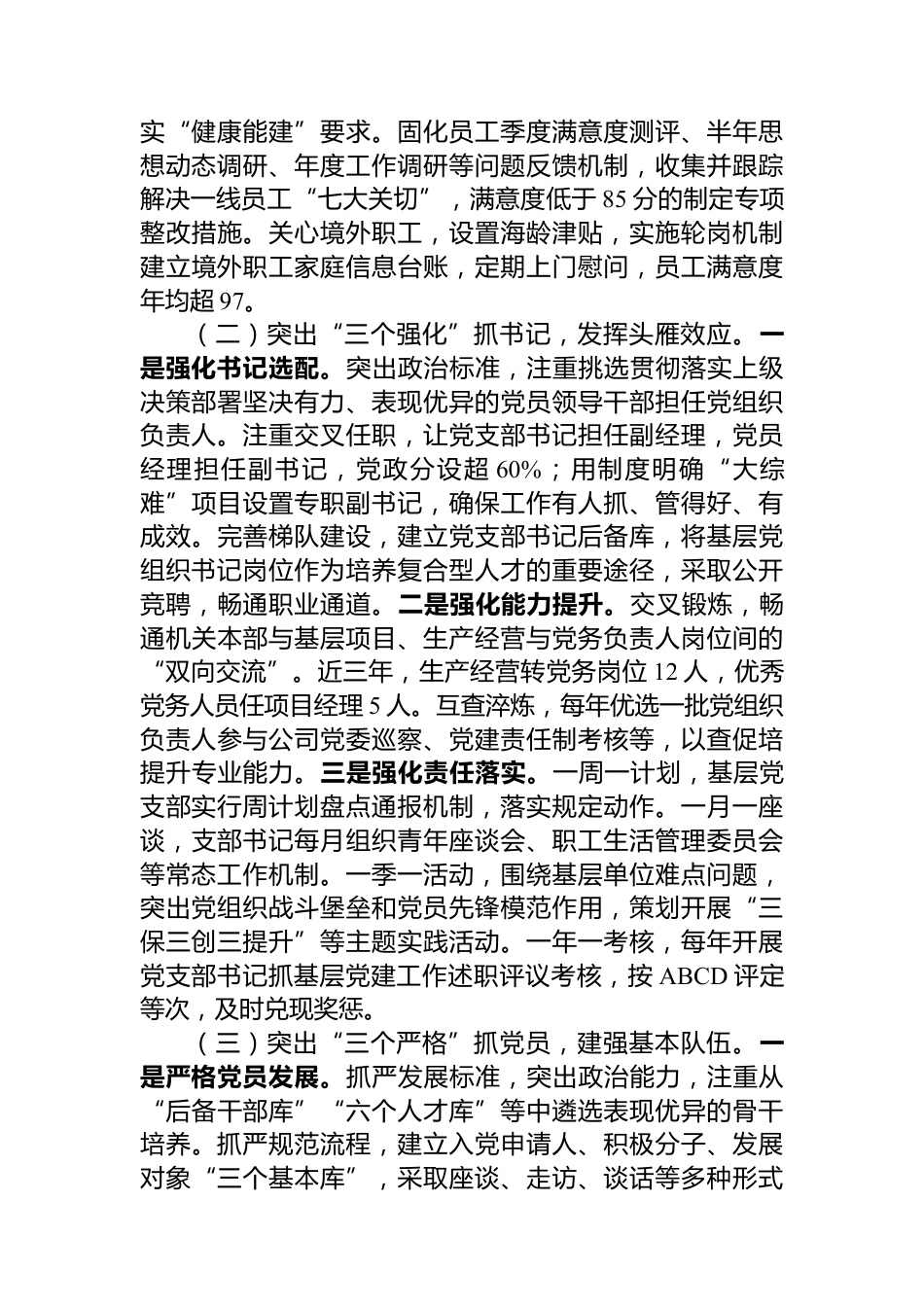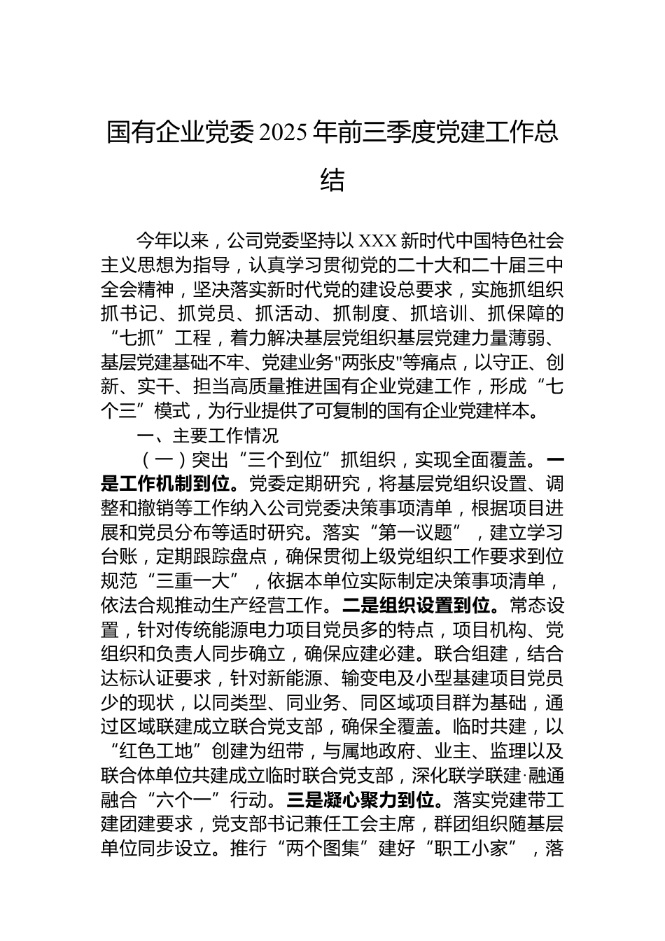 國有企業(yè)黨委2025年前三季度黨建工作總結今年以來,公司黨委堅持以XXX新時代中國特色社會主義思想為指導,認真學習貫徹黨的二十大和二十屆三中全會精神,堅決落實新時代黨的建設總要求,實施抓組織抓書記、抓黨員、抓活動、抓制度、抓培訓、抓保障的“七抓”工程,著力解決基層黨組織基層黨建力量薄弱、基層黨建基礎不牢、黨建業(yè)務"兩張皮"等痛點,以守正、創(chuàng)新、實干、擔當高質量推進國有企業(yè)黨建工作,形成“七個三”模式,為行業(yè)提供了可復制的國有企業(yè)黨建樣本。一、主要工作情況(一)突出“三個到位”抓組織,實現(xiàn)全面覆蓋。一是工作機制到位。黨委定期研究,將基...