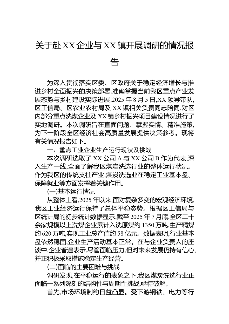 關(guān)于赴XX企業(yè)與XX鎮(zhèn)開展調(diào)研的情況報告為深入貫徹落實(shí)區(qū)委、區(qū)政府關(guān)于穩(wěn)定經(jīng)濟(jì)增長與推進(jìn)鄉(xiāng)村全面振興的決策部署,準(zhǔn)確掌握當(dāng)前我區(qū)重點(diǎn)產(chǎn)業(yè)發(fā)展態(tài)勢與鄉(xiāng)村建設(shè)實(shí)際進(jìn)展,2025年8月5日,XX領(lǐng)導(dǎo)帶隊,區(qū)工信局、區(qū)農(nóng)業(yè)農(nóng)村局及XX鎮(zhèn)相關(guān)負(fù)責(zé)同志陪同,對區(qū)內(nèi)部分重點(diǎn)洗煤企業(yè)及XX鎮(zhèn)鄉(xiāng)村振興項目建設(shè)情況進(jìn)行了實(shí)地調(diào)研。本次調(diào)研旨在直面問題、掌握實(shí)情、精準(zhǔn)施策,為下一階段全區(qū)經(jīng)濟(jì)社會高質(zhì)量發(fā)展提供決策參考?,F(xiàn)將有關(guān)情況報告如下。一、重點(diǎn)工業(yè)企業(yè)生產(chǎn)運(yùn)行現(xiàn)狀及挑戰(zhàn)本次調(diào)研選取了XX公司A與XX公司B作為代表,深入生產(chǎn)一線,全面了解我區(qū)煤炭洗選行業(yè)的整體運(yùn)行狀況。作為...
