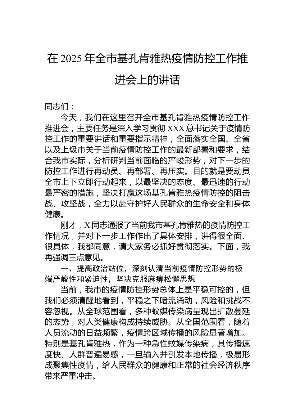 在2025年全市基孔肯雅熱疫情防控工作推進(jìn)會(huì)上的講話(huà)同志們:今天,我們?cè)谶@里召開(kāi)全市基孔肯雅熱疫情防控工作推進(jìn)會(huì),主要任務(wù)是深入學(xué)習(xí)貫徹XXX總書(shū)記關(guān)于疫情防控工作的重要講話(huà)和重要指示精神,全面落實(shí)全國(guó)、全省以及上級(jí)市關(guān)于當(dāng)前疫情防控工作的最新部署和要求,結(jié)合我市實(shí)際,分析研判當(dāng)前面臨的嚴(yán)峻形勢(shì),對(duì)下一步的防控工作進(jìn)行再動(dòng)員、再部署、再壓實(shí)。目的就是要?jiǎng)訂T全市上下立即行動(dòng)起來(lái),以最堅(jiān)決的態(tài)度、最迅速的行動(dòng)最嚴(yán)密的措施,堅(jiān)決打贏這場(chǎng)基孔肯雅熱疫情防控的阻擊戰(zhàn)、攻堅(jiān)戰(zhàn),全力以赴守護(hù)好人民群眾的生命安全和身體健康。剛才,X同志通報(bào)了當(dāng)前我...