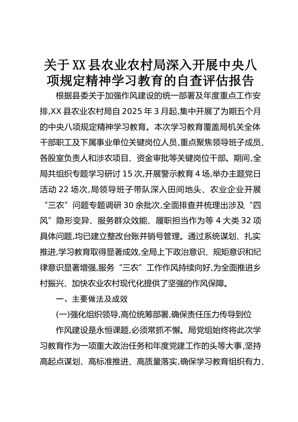 關(guān)于XX縣農(nóng)業(yè)農(nóng)村局深入開展中央八項規(guī)定精神學(xué)習(xí)教育的自查評估報告