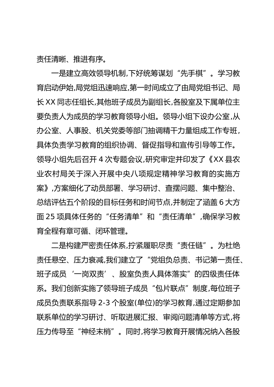 關(guān)于XX縣農(nóng)業(yè)農(nóng)村局深入開展中央八項規(guī)定精神學(xué)習(xí)教育的自查評估報告根據(jù)縣委關(guān)于加強作風(fēng)建設(shè)的統(tǒng)一部署及年度重點工作安排,XX縣農(nóng)業(yè)農(nóng)村局自2025年3月起,集中開展了為期五個月的中央八項規(guī)定精神學(xué)習(xí)教育。本次學(xué)習(xí)教育覆蓋局機關(guān)全體干部職工及下屬事業(yè)單位關(guān)鍵崗位人員,重點聚焦領(lǐng)導(dǎo)班子成員、各股室負(fù)責(zé)人和涉農(nóng)項目、資金審批等關(guān)鍵崗位干部。期間,全局共組織專題學(xué)習(xí)研討15次,開展警示教育4場,舉辦主題黨日活動22場次,局領(lǐng)導(dǎo)班子帶隊深入田間地頭、農(nóng)業(yè)企業(yè)開展“三農(nóng)”問題專題調(diào)研30余批次,全面排查并梳理出涉及“四風(fēng)”隱形變異、服務(wù)群眾效能、履職擔(dān)當(dāng)作為等...