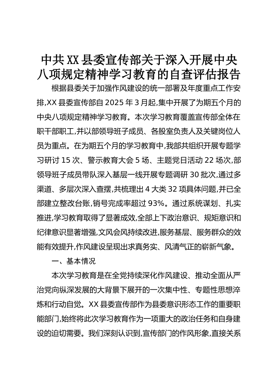 中共XX縣委宣傳部關(guān)于深入開(kāi)展中央八項(xiàng)規(guī)定精神學(xué)習(xí)教育的自查評(píng)估報(bào)告