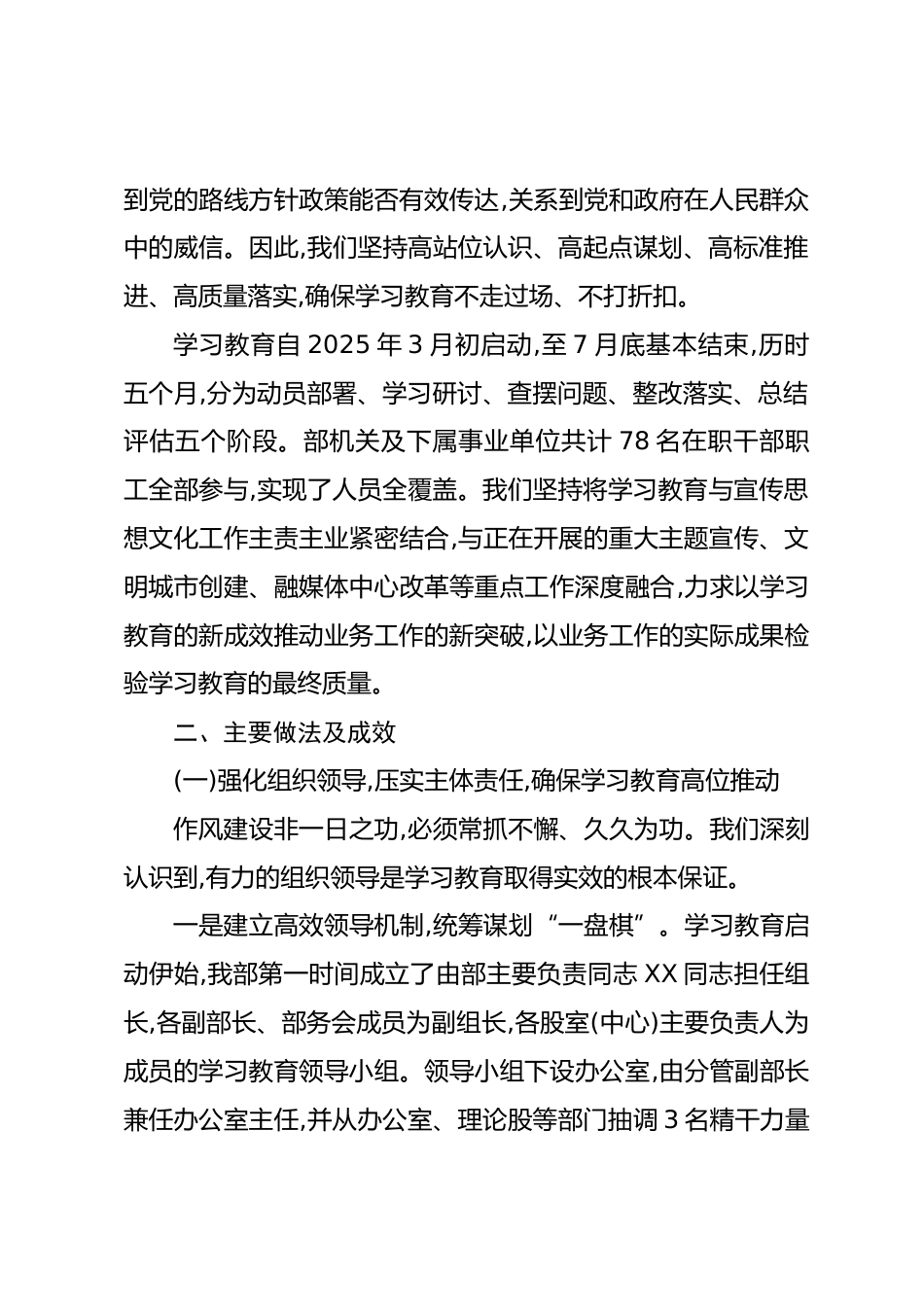中共XX縣委宣傳部關(guān)于深入開(kāi)展中央八項(xiàng)規(guī)定精神學(xué)習(xí)教育的自查評(píng)估報(bào)告根據(jù)縣委關(guān)于加強(qiáng)作風(fēng)建設(shè)的統(tǒng)一部署及年度重點(diǎn)工作安排,XX縣委宣傳部自2025年3月起,集中開(kāi)展了為期五個(gè)月的中央八項(xiàng)規(guī)定精神學(xué)習(xí)教育。本次學(xué)習(xí)教育覆蓋宣傳部全體在職干部職工,并以部領(lǐng)導(dǎo)班子成員、各股室負(fù)責(zé)人及關(guān)鍵崗位人員為重點(diǎn)。在為期五個(gè)月的學(xué)習(xí)教育中,我部共組織開(kāi)展專題學(xué)習(xí)研討15次、警示教育大會(huì)5場(chǎng)、主題黨日活動(dòng)22場(chǎng)次,部領(lǐng)導(dǎo)班子成員帶隊(duì)深入基層一線開(kāi)展專題調(diào)研30批次,通過(guò)多渠道、多層次深入查擺,共梳理出4大類32項(xiàng)具體問(wèn)題,并已全部建立整改臺(tái)賬,銷號(hào)完成率超過(guò)93%。通過(guò)系統(tǒng)...