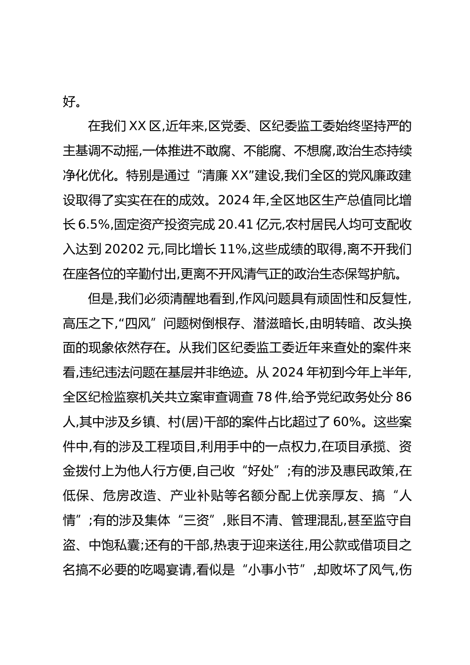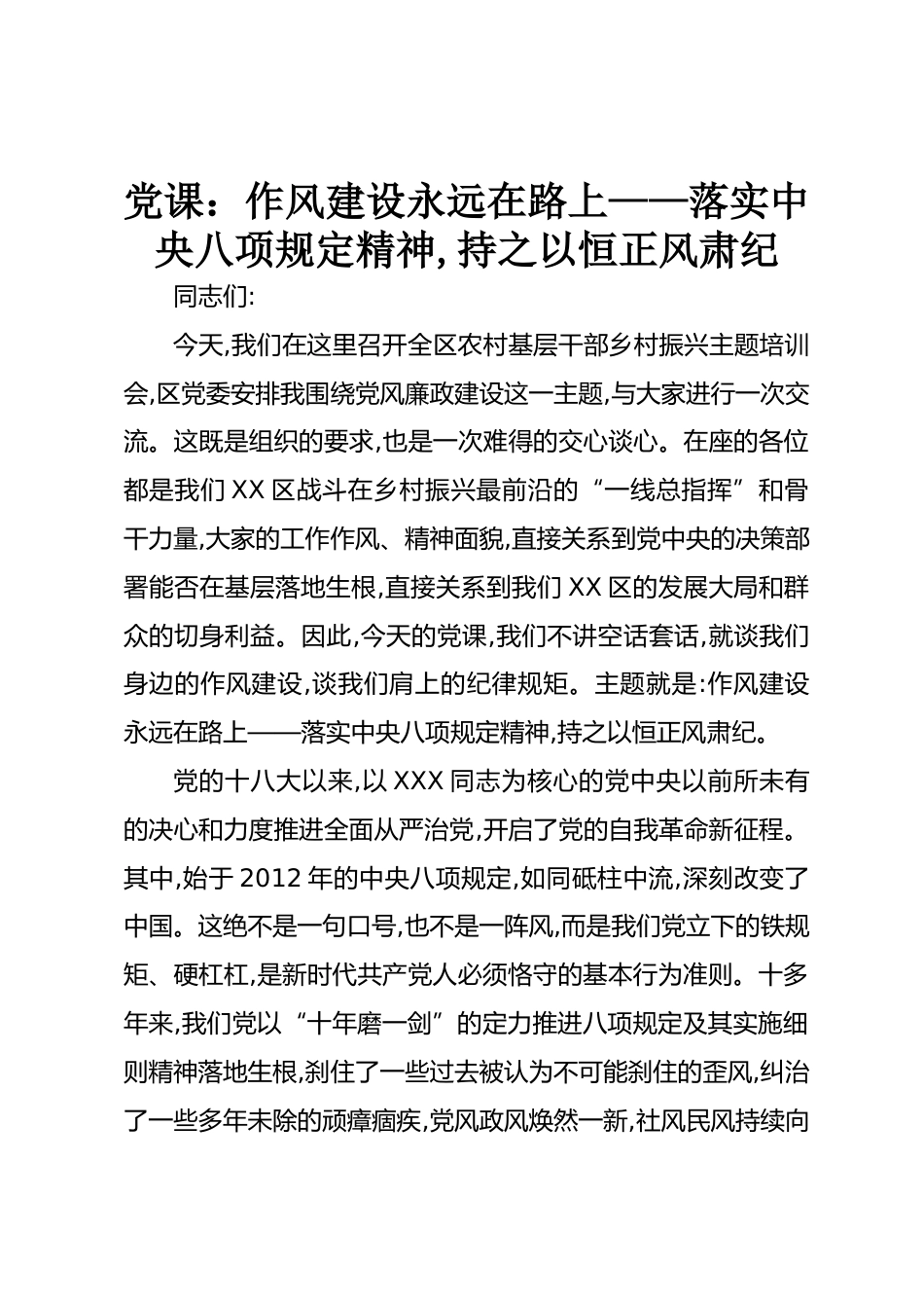 黨課:作風建設(shè)永遠在路上——落實中央八項規(guī)定精神,持之以恒正風肅紀同志們:今天,我們在這里召開全區(qū)農(nóng)村基層干部鄉(xiāng)村振興主題培訓會,區(qū)黨委安排我圍繞黨風廉政建設(shè)這一主題,與大家進行一次交流。這既是組織的要求,也是一次難得的交心談心。在座的各位都是我們XX區(qū)戰(zhàn)斗在鄉(xiāng)村振興最前沿的“一線總指揮”和骨干力量,大家的工作作風、精神面貌,直接關(guān)系到黨中央的決策部署能否在基層落地生根,直接關(guān)系到我們XX區(qū)的發(fā)展大局和群眾的切身利益。因此,今天的黨課,我們不講空話套話,就談我們身邊的作風建設(shè),談我們肩上的紀律規(guī)矩。主題就是:作風建設(shè)永遠在路上——落實中央八項...