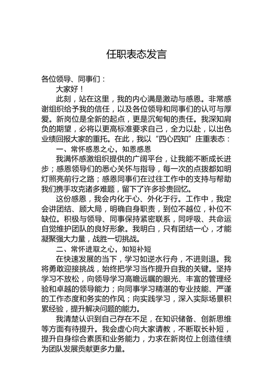 任職表態(tài)發(fā)言各位領(lǐng)導(dǎo)、同事們:大家好!此刻,站在這里,我的內(nèi)心滿是激動(dòng)與感恩。非常感謝組織給予我的信任,以及各位領(lǐng)導(dǎo)和同事們的認(rèn)可與厚愛(ài)。新崗位是全新的起點(diǎn),更是沉甸甸的責(zé)任。我深知肩負(fù)的期望,必將以更高標(biāo)準(zhǔn)要求自己,全力以赴,以出色業(yè)績(jī)回報(bào)大家的重托。在此,我以“四心四知”莊重表態(tài):一、常懷感恩之心,知恩感恩我滿懷感激組織提供的廣闊平臺(tái),讓我能不斷成長(zhǎng)進(jìn)步;感恩領(lǐng)導(dǎo)們的悉心關(guān)懷與指導(dǎo),每一次的點(diǎn)撥都如明燈照亮前行之路;感恩同事們?cè)谶^(guò)往工作中的支持與幫助我們攜手攻克諸多難題,留下了許多珍貴回憶。這份感恩,我會(huì)內(nèi)化于心、外化于...