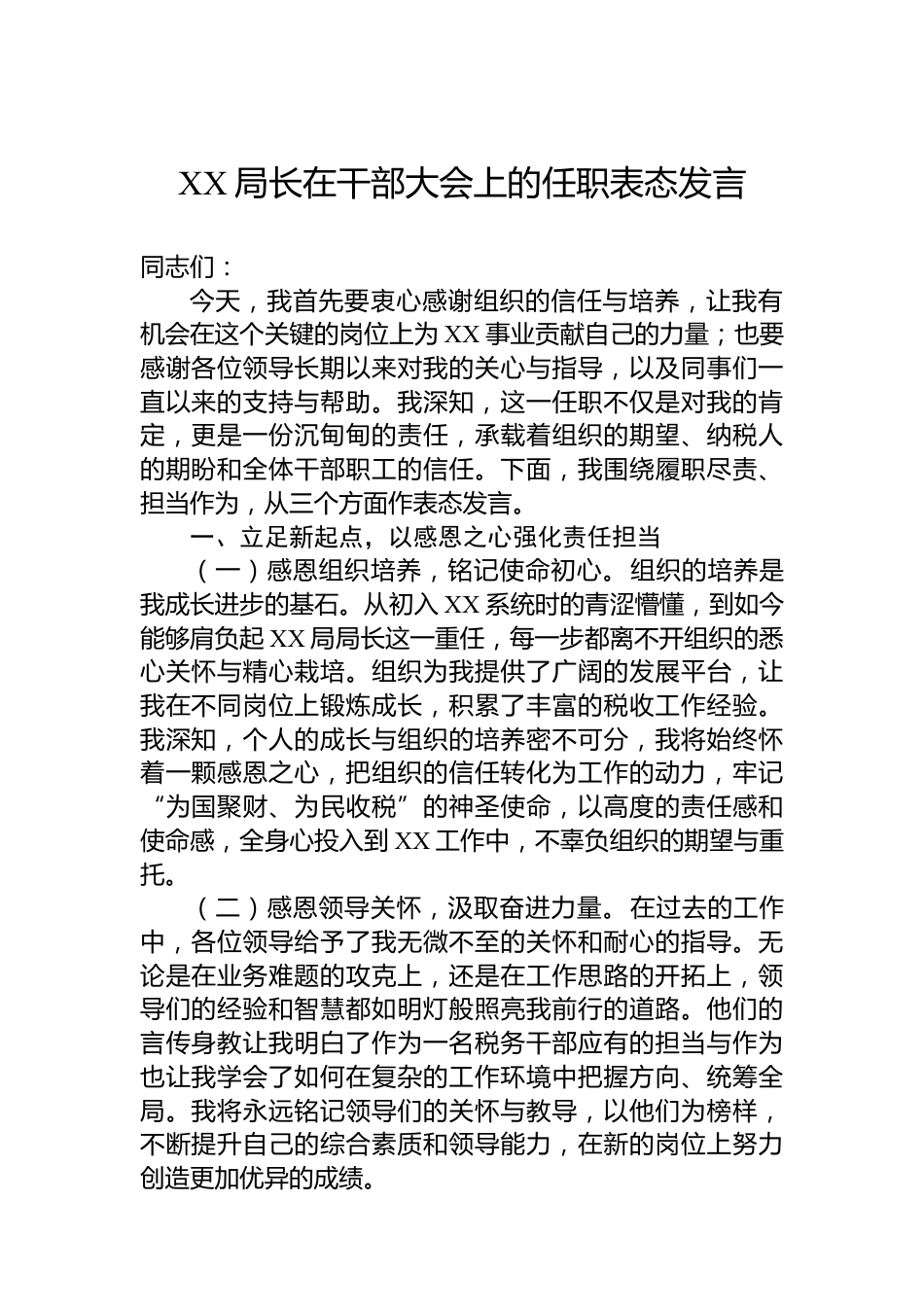 XX局長(zhǎng)在干部大會(huì)上的任職表態(tài)發(fā)言同志們:今天,我首先要衷心感謝組織的信任與培養(yǎng),讓我有機(jī)會(huì)在這個(gè)關(guān)鍵的崗位上為XX事業(yè)貢獻(xiàn)自己的力量;也要感謝各位領(lǐng)導(dǎo)長(zhǎng)期以來對(duì)我的關(guān)心與指導(dǎo),以及同事們一直以來的支持與幫助。我深知,這一任職不僅是對(duì)我的肯定,更是一份沉甸甸的責(zé)任,承載著組織的期望、納稅人的期盼和全體干部職工的信任。下面,我圍繞履職盡責(zé)、擔(dān)當(dāng)作為,從三個(gè)方面作表態(tài)發(fā)言。一、立足新起點(diǎn),以感恩之心強(qiáng)化責(zé)任擔(dān)當(dāng)(一)感恩組織培養(yǎng),銘記使命初心。組織的培養(yǎng)是我成長(zhǎng)進(jìn)步的基石。從初入XX系統(tǒng)時(shí)的青澀懵懂,到如今能夠肩負(fù)起XX局局長(zhǎng)這一重任,...