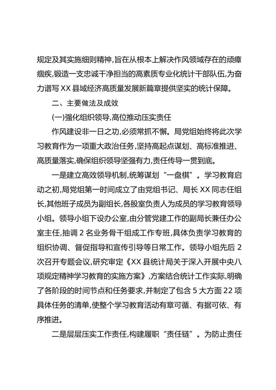 縣統(tǒng)計局深入開展中央八項規(guī)定精神學(xué)習(xí)教育的自查評估報告根據(jù)縣委關(guān)于加強作風(fēng)建設(shè)的統(tǒng)一部署及年度重點工作安排,XX縣統(tǒng)計局自2025年3月起,集中開展了為期五個月的中央八項規(guī)定精神學(xué)習(xí)教育。本次學(xué)習(xí)教育覆蓋局全體在職干部職工,重點突出領(lǐng)導(dǎo)班子、股室負(fù)責(zé)人及關(guān)鍵崗位人員。期間,全局共組織開展專題學(xué)習(xí)研討8次,舉辦警示教育大會2場,開展主題黨日活動6次,深入基層一線開展統(tǒng)計調(diào)研15批次,全面排查梳理出3大類18項具體問題,并已全部建立臺賬、銷號管理。通過系統(tǒng)謀劃、扎實推進(jìn),學(xué)習(xí)教育取得顯著成效,全局上下政治意識、規(guī)矩意識和紀(jì)律意識顯著增強,統(tǒng)計工作作風(fēng)持續(xù)...