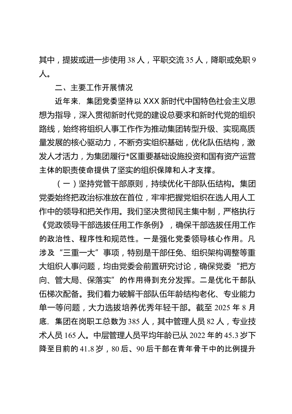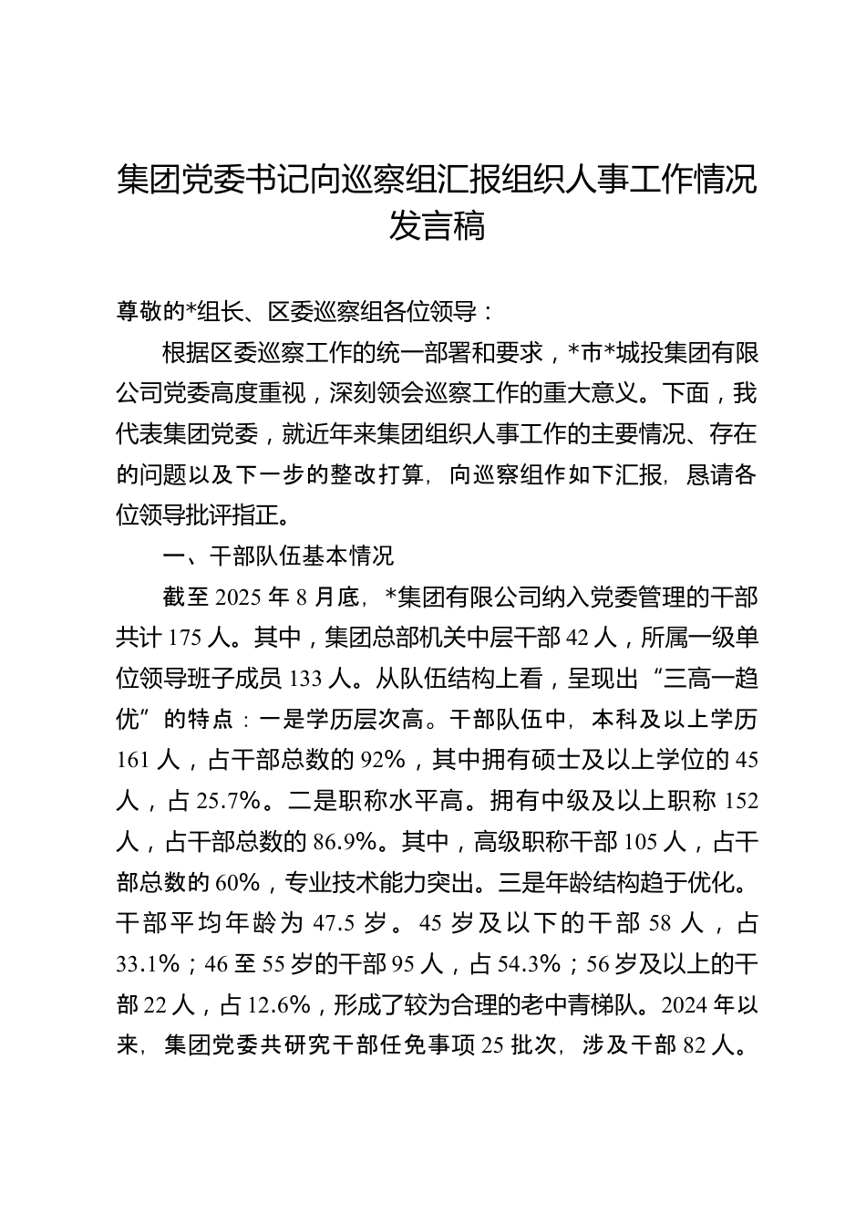 集團(tuán)黨委書記向巡察組匯報(bào)組織人事工作情況發(fā)言稿尊敬的*組長、區(qū)委巡察組各位領(lǐng)導(dǎo):根據(jù)區(qū)委巡察工作的統(tǒng)一部署和要求,*市*城投集團(tuán)有限公司黨委高度重視,深刻領(lǐng)會巡察工作的重大意義。下面,我代表集團(tuán)黨委,就近年來集團(tuán)組織人事工作的主要情況、存在的以及下一步的整改打算,向巡察作如下,各問題組匯報(bào)懇請位領(lǐng)導(dǎo)批評指正。一、干部隊(duì)伍基本情況截至2025年8月底,*集團(tuán)有限公司納入黨委管理的干部共計(jì)175人。其中,集團(tuán)總部機(jī)關(guān)中層干部42人,所屬一級單位領(lǐng)導(dǎo)班子成員133人。從隊(duì)伍結(jié)構(gòu)上看,呈現(xiàn)出“三高一趨優(yōu)”的特點(diǎn):一是學(xué)次高。干部伍中,本科及以上學(xué)歷...