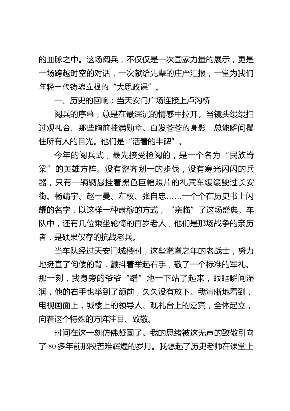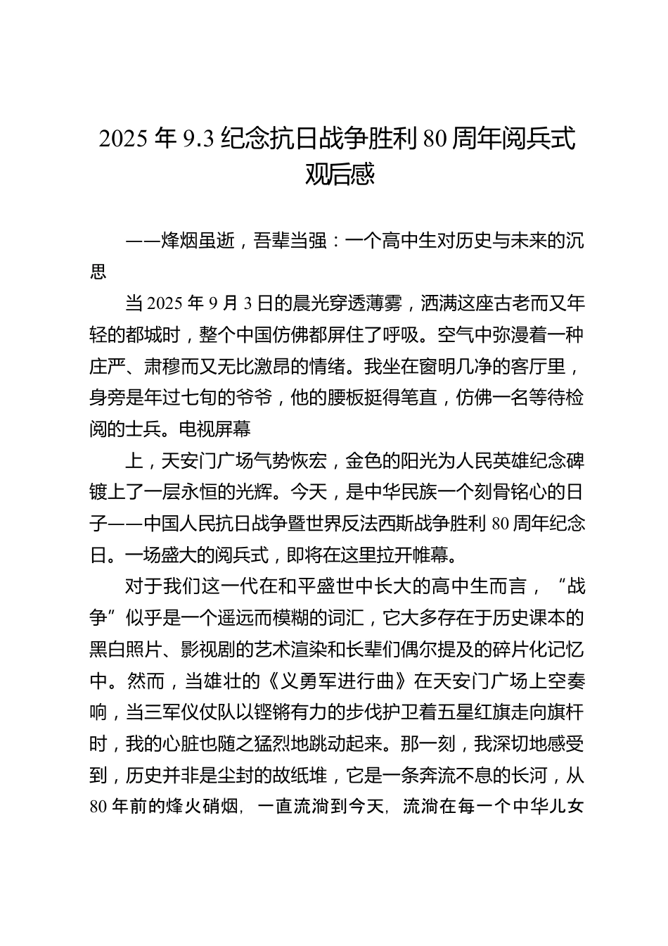 《2025年9.3紀(jì)念抗日戰(zhàn)爭(zhēng)勝利80周年閱兵式觀后感 ————烽煙雖逝,吾輩當(dāng)強(qiáng):一個(gè)高中生對(duì)歷史與未來(lái)的沉思》