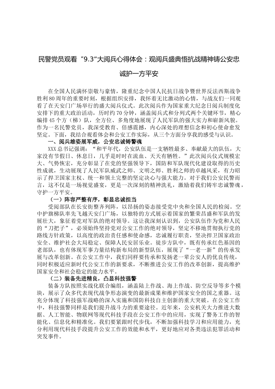 民警黨員觀看“9.3”大閱兵心得體會(huì):觀閱兵盛典悟抗戰(zhàn)精神鑄公安忠誠(chéng)護(hù)一方平安在全國(guó)人民滿懷崇敬與豪情,隆重紀(jì)念中國(guó)人民抗日戰(zhàn)爭(zhēng)暨世界反法西斯戰(zhàn)爭(zhēng)勝利80周年的重要時(shí)刻,根據(jù)組織安排,我懷著無(wú)比激動(dòng)的心情,與戰(zhàn)友們一同觀看了在天安門廣場(chǎng)舉行的盛大閱兵儀式。此次閱兵作為國(guó)家重大紀(jì)念日閱兵制度化安排下的重大政治活動(dòng),歷時(shí)約70分鐘,涵蓋閱兵式和分列式兩個(gè)關(guān)鍵環(huán)節(jié),精心編排45個(gè)方(梯)隊(duì),全方位、多角度地展現(xiàn)了人民軍隊(duì)的強(qiáng)大實(shí)力和嶄新風(fēng)貌。作為一名民警黨員,我深受教育、倍感震撼,內(nèi)心深處的理想信念和初心使命愈發(fā)堅(jiān)定。下面,我結(jié)合觀看體會(huì)...