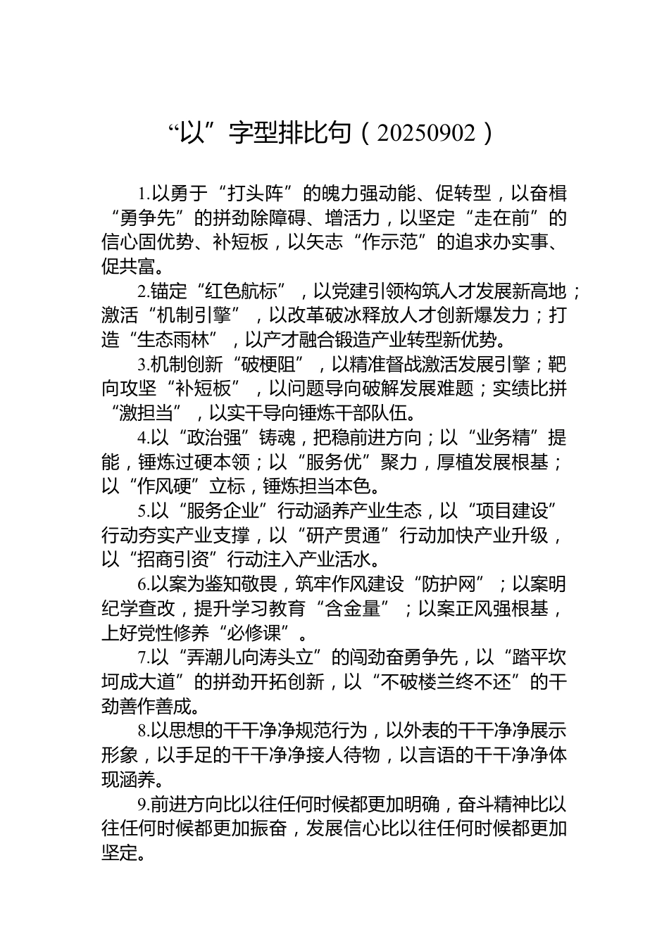 “以”字型排比句(20250902)1.以勇于“打頭陣”的魄力強(qiáng)動(dòng)能、促轉(zhuǎn)型,以?shī)^楫“勇?tīng)?zhēng)先”的拼勁除障礙、增活力,以堅(jiān)定“走在前”的信心固優(yōu)勢(shì)、補(bǔ)短板,以矢志“作示范”的追求辦實(shí)事、促共富。2.錨定“紅色航標(biāo)”,以黨建引領(lǐng)構(gòu)筑人才發(fā)展新高地;激活“機(jī)制引擎”,以改革破冰釋放人才創(chuàng)新爆發(fā)力;打造“生態(tài)雨林”,以產(chǎn)才融合鍛造產(chǎn)業(yè)轉(zhuǎn)型新優(yōu)勢(shì)。3.機(jī)制創(chuàng)新“破梗阻”,以精準(zhǔn)督戰(zhàn)激活發(fā)展引擎;靶向攻堅(jiān)“補(bǔ)短板”,以問(wèn)題導(dǎo)向破解發(fā)展難題;實(shí)績(jī)比拼“激擔(dān)當(dāng)”,以實(shí)干導(dǎo)向錘煉干部隊(duì)伍。4.以“政治強(qiáng)”鑄魂,把穩(wěn)前進(jìn)方向;以“業(yè)務(wù)精”提能,錘煉過(guò)硬本領(lǐng);以...