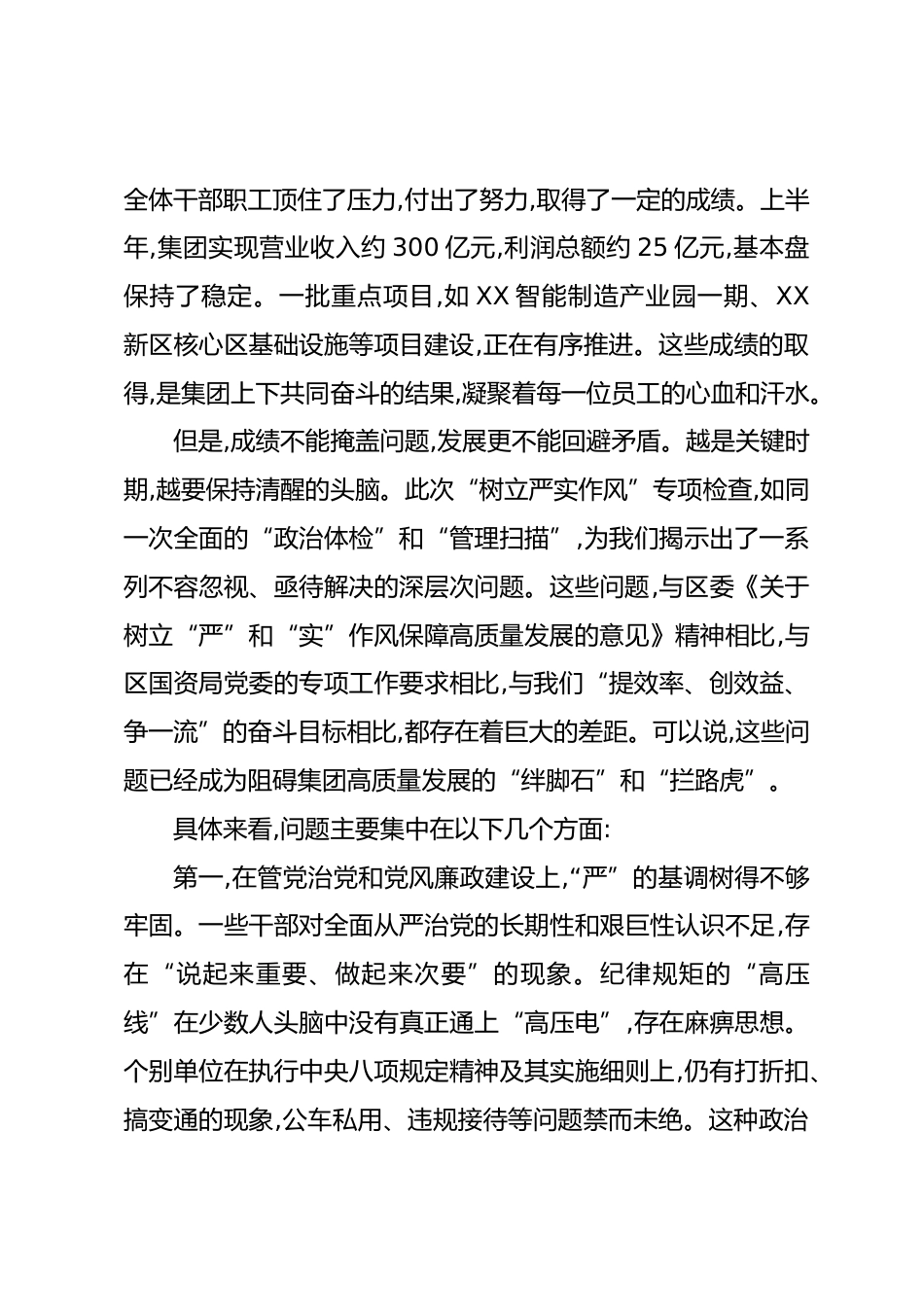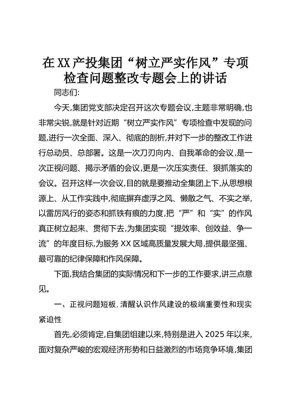 在XX產(chǎn)投集團(tuán)“樹立嚴(yán)實(shí)作風(fēng)”專項(xiàng)檢查問題整改專題會(huì)上的講話
