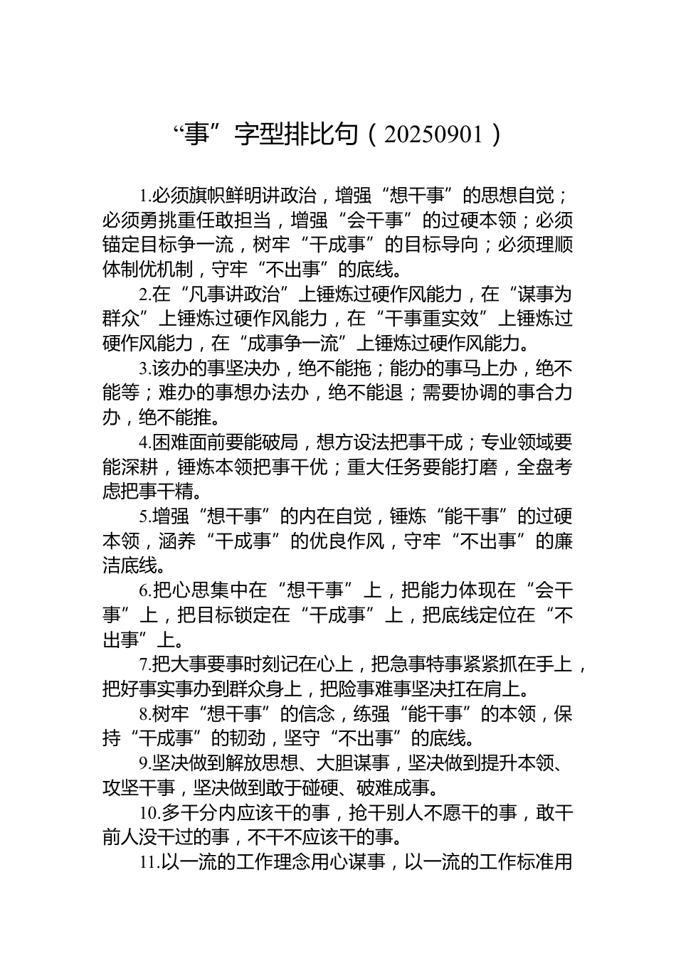 “事”字型排比句(20250901)1.必須旗幟鮮明講政治,增強(qiáng)“想干事”的思想自覺;必須勇挑重任敢擔(dān)當(dāng),增強(qiáng)“會干事”的過硬本領(lǐng);必須錨定目標(biāo)爭一流,樹牢“干成事”的目標(biāo)導(dǎo)向;必須理順體制優(yōu)機(jī)制,守牢“不出事”的底線。2.在“凡事講政治”上錘煉過硬作風(fēng)能力,在“謀事為群眾”上錘煉過硬作風(fēng)能力,在“干事重實(shí)效”上錘煉過硬作風(fēng)能力,在“成事爭一流”上錘煉過硬作風(fēng)能力。3.該辦的事堅(jiān)決辦,絕不能拖;能辦的事馬上辦,絕不能等;難辦的事想辦法辦,絕不能退;需要協(xié)調(diào)的事合力辦,絕不能推。4.困難面前要能破局,想方設(shè)法把事干成;專業(yè)領(lǐng)域要能深耕,錘煉本...