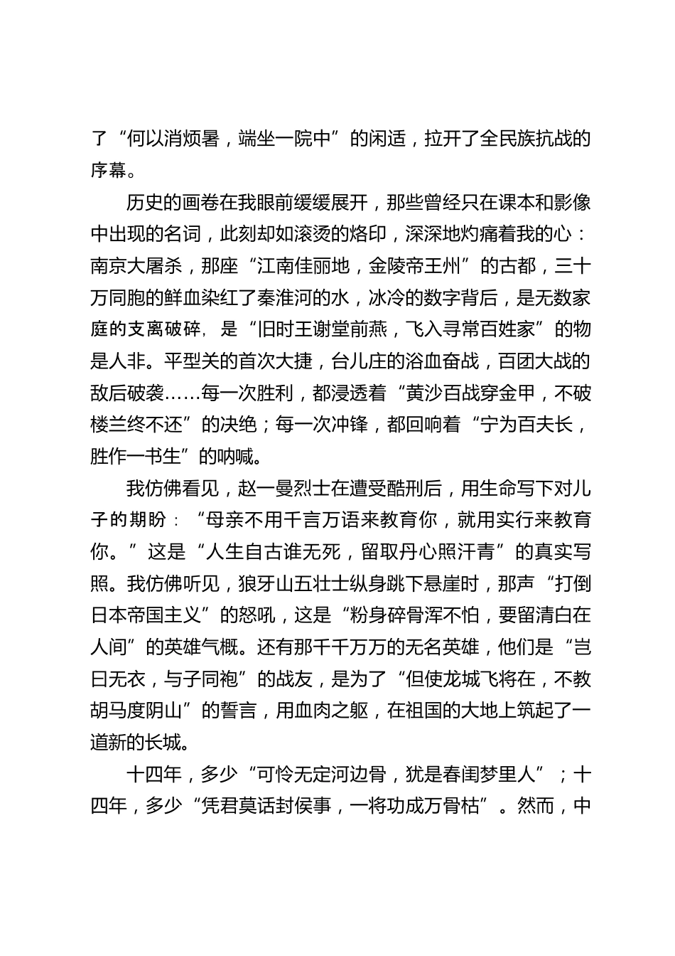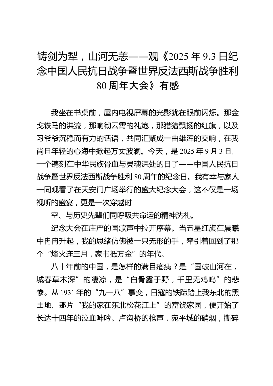 鑄劍為犁,山河無恙——觀《2025年9.3日紀(jì)念中國人民抗日戰(zhàn)爭暨世界反法西斯戰(zhàn)爭勝利80周年大會》有感我坐在書桌前,屋內(nèi)電視屏幕的光影猶在眼前閃爍。那金戈鐵馬的洪流,那響徹云霄的禮炮,那獵獵飄揚的紅旗,以及習(xí)爺爺沉穩(wěn)而有力的話語,共同匯聚成一曲雄渾的交響,在我尚且年輕的心海中掀起萬丈波瀾。今天,是2025年9月3日,一個鐫刻在中華民族骨血與靈魂深處的日子——中國人民抗日戰(zhàn)爭暨世界反法西斯戰(zhàn)爭勝利80周年的紀(jì)念日。我有幸與家人一同觀看了在天安門廣場舉行的盛大紀(jì)念大會,這不僅是一場視聽的盛宴,更是一次穿越時空、與歷史先輩們同呼吸共命運的精神洗...