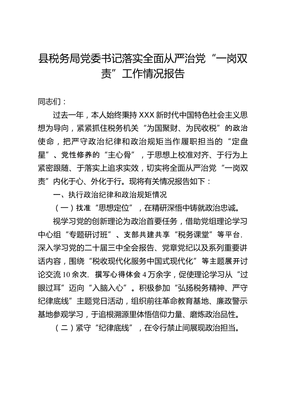 縣稅務(wù)局黨委書記落實全面從嚴(yán)治黨“一崗雙責(zé)”工作情況報告同志們:過去一年,本人始終秉持XXX新時代中國特色社會主義思想為導(dǎo)向,緊緊抓住稅務(wù)機關(guān)“為國聚財、為民收稅”的政治使命,把嚴(yán)守政治紀(jì)律和政治規(guī)矩當(dāng)作履職擔(dān)當(dāng)?shù)摹岸ūP星”、黨性修養(yǎng)的“主心骨”,于思想上校準(zhǔn)對齊、于行為上緊密跟隨、于落實上追求實效,切實將全面從嚴(yán)治黨“一崗雙責(zé)”內(nèi)化于心、外化于行?,F(xiàn)將有關(guān)情況報告如下:一、執(zhí)行政治紀(jì)律和政治規(guī)矩情況(一)找準(zhǔn)“思想定位”,在精研深悟中鑄就政治忠誠。視學(xué)習(xí)黨的創(chuàng)新理論為政治首要任務(wù),借助黨組理論學(xué)習(xí)中心組“專題研討班”、支部共...