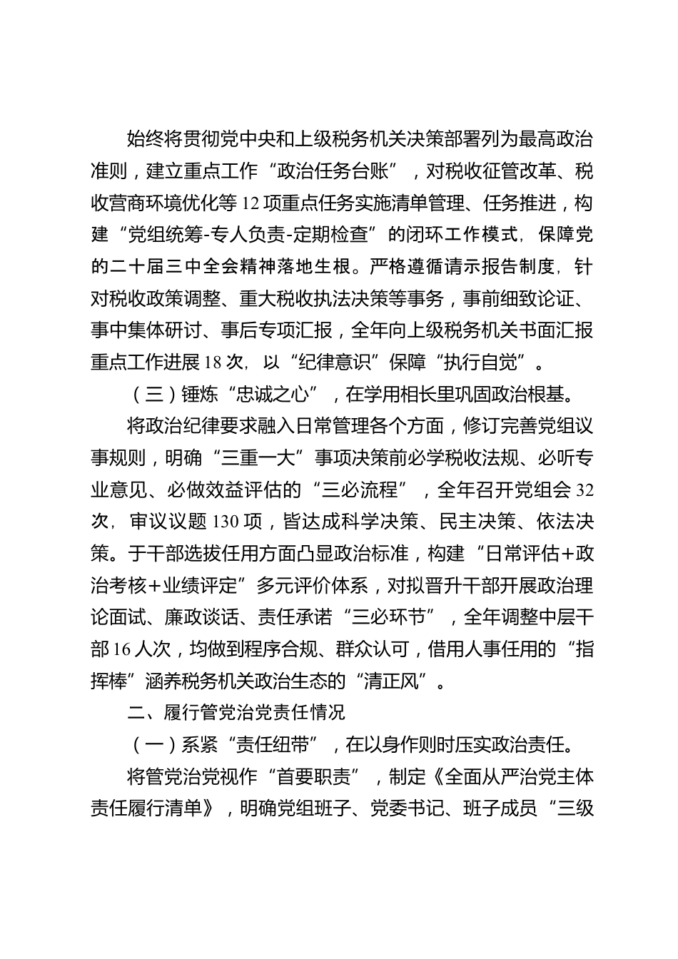 縣稅務(wù)局黨委書記落實全面從嚴(yán)治黨“一崗雙責(zé)”工作情況報告