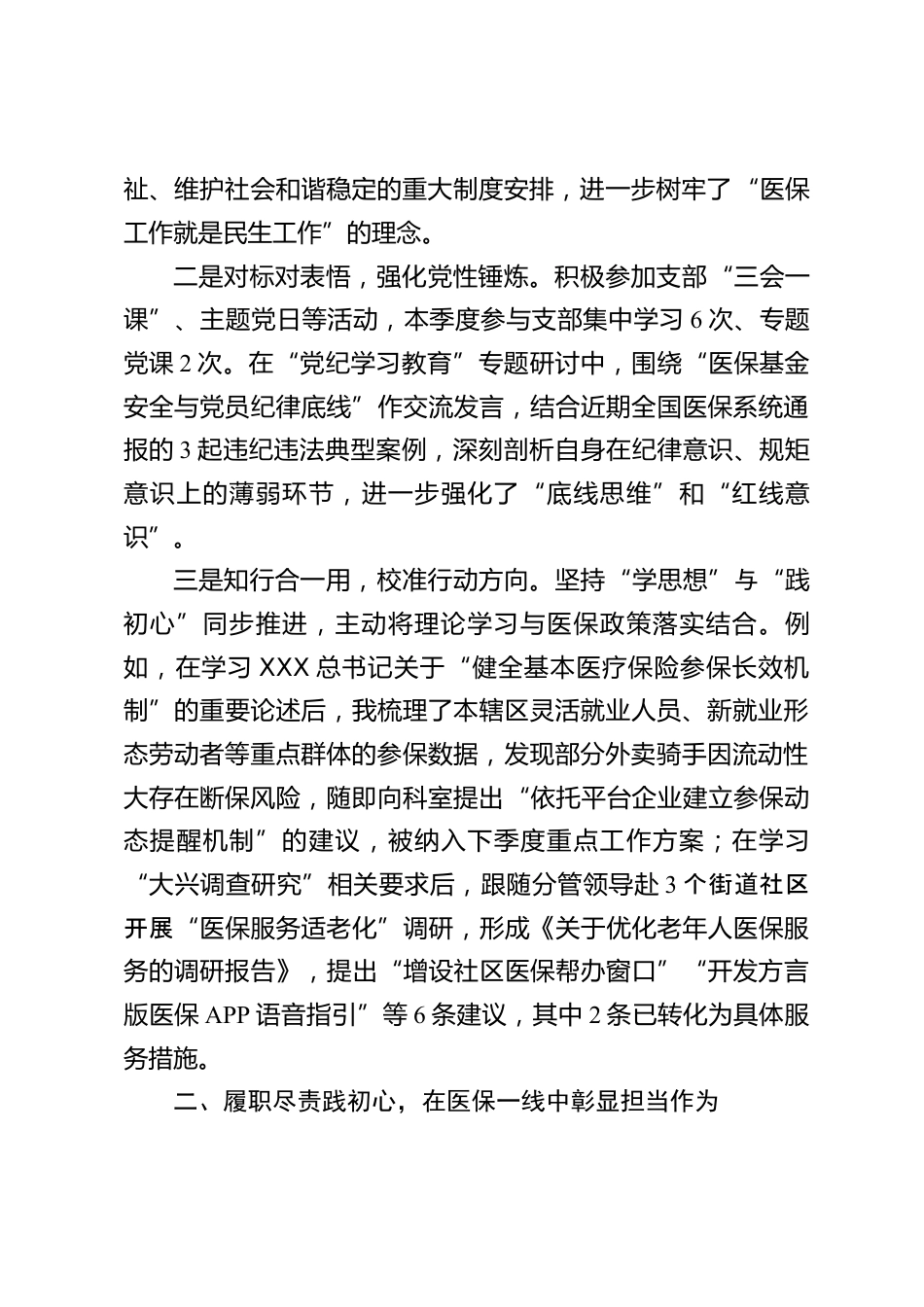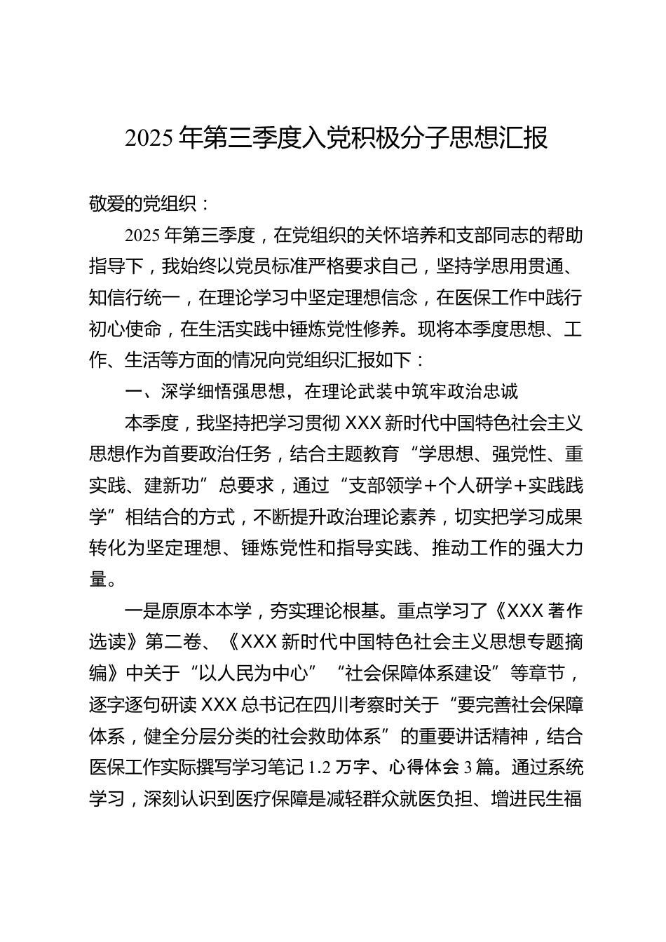 2025年第三季度入黨積極分子思想?yún)R報(bào)敬愛(ài)的黨組織:2025年第三季度,在黨組織的關(guān)懷培養(yǎng)和支部同志的幫助指導(dǎo)下,我始終以黨員標(biāo)準(zhǔn)嚴(yán)格要求自己,堅(jiān)持學(xué)思用貫通、知信行統(tǒng)一,在理論學(xué)習(xí)中堅(jiān)定理想信念,在醫(yī)保工作中踐行初心使命,在生活實(shí)踐中錘煉黨性修養(yǎng)。現(xiàn)將本季度思想、工作、生活等方面的情況向黨組織匯報(bào)如下:一、深學(xué)細(xì)悟強(qiáng)思想,在理論武裝中筑牢政治忠誠(chéng)本季度,我堅(jiān)持把學(xué)習(xí)貫徹XXX新時(shí)代中國(guó)特色社會(huì)主義思想作為首要政治任務(wù),結(jié)合主題教育“學(xué)思想、強(qiáng)黨性、重實(shí)踐、建新功”總要求,通過(guò)“支部領(lǐng)學(xué)+個(gè)人研學(xué)+實(shí)踐踐學(xué)”相結(jié)合的方式,不斷提升政治理...
