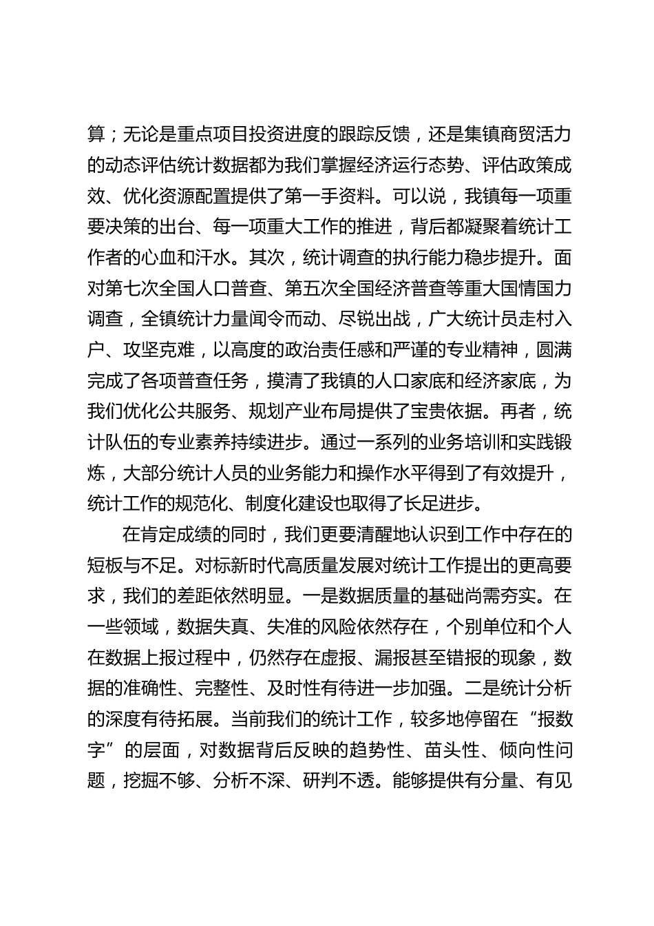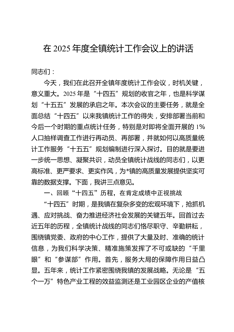 在2025年度全鎮(zhèn)統(tǒng)計工作會議上的講話同志們:今天,我們在此召開全鎮(zhèn)年度統(tǒng)計工作會議,時機關(guān)鍵,意義重大。2025年是“十四五”規(guī)劃的收官之年,也是科學謀劃“十五五”發(fā)展的承啟之年。本次會議的主要任務,就是全面總結(jié)“十四五”以來我鎮(zhèn)統(tǒng)計工作的得失,安排部署當前和今后一個時期的重點統(tǒng)計任務,特別是對即將全面開展的1%人口抽樣調(diào)查工作進行再動員、再部署,并就如何以高質(zhì)量統(tǒng)計工作服務“十五五”規(guī)劃編制進行深入探討。目的就是要進一步統(tǒng)一思想、凝聚共識,動員全鎮(zhèn)統(tǒng)計戰(zhàn)線的同志們,以更高標準、更嚴要求、更實作風,為*鎮(zhèn)的高質(zhì)量發(fā)展提供堅實可靠的數(shù)...