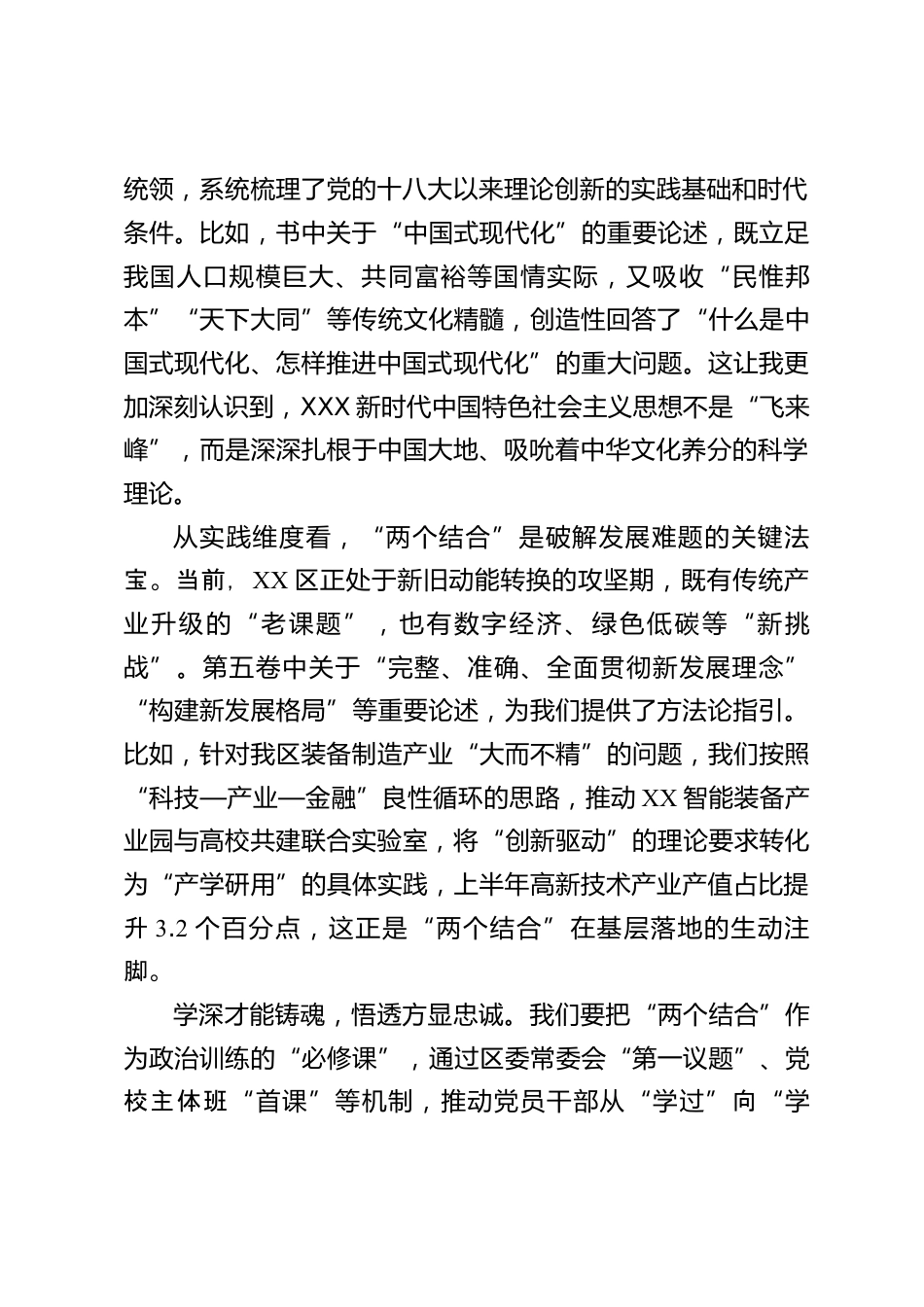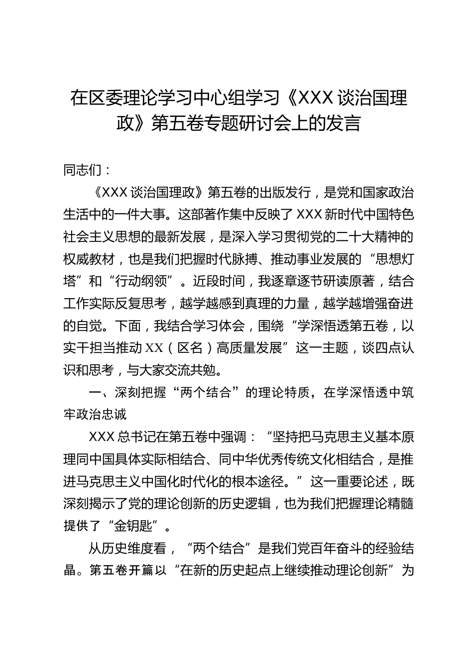 在區(qū)委理論學習中心組學習《XXX談治國理政》第五卷專題研討會上的發(fā)言同志們:《XXX談治國理政》第五卷的出版發(fā)行,是黨和國家政治生活中的一件大事。這部著作集中反映了XXX新時代中國特色社會主義思想的最新發(fā)展,是深入學習貫徹黨的二十大精神的權威教材,也是我們把握時代脈搏、推動事業(yè)發(fā)展的“思想燈塔”和“行動綱領”。近段時間,我逐章逐節(jié)研讀原著,結(jié)合工作實際反復思考,越學越感到真理的力量,越學越增強奮進的自覺。下面,我結(jié)合學習體會,圍繞“學深悟透第五卷,以實干擔當推動XX(區(qū)名)高質(zhì)量發(fā)展”這一主題,談四點認識和思考,與大家交流共勉。一、深...
