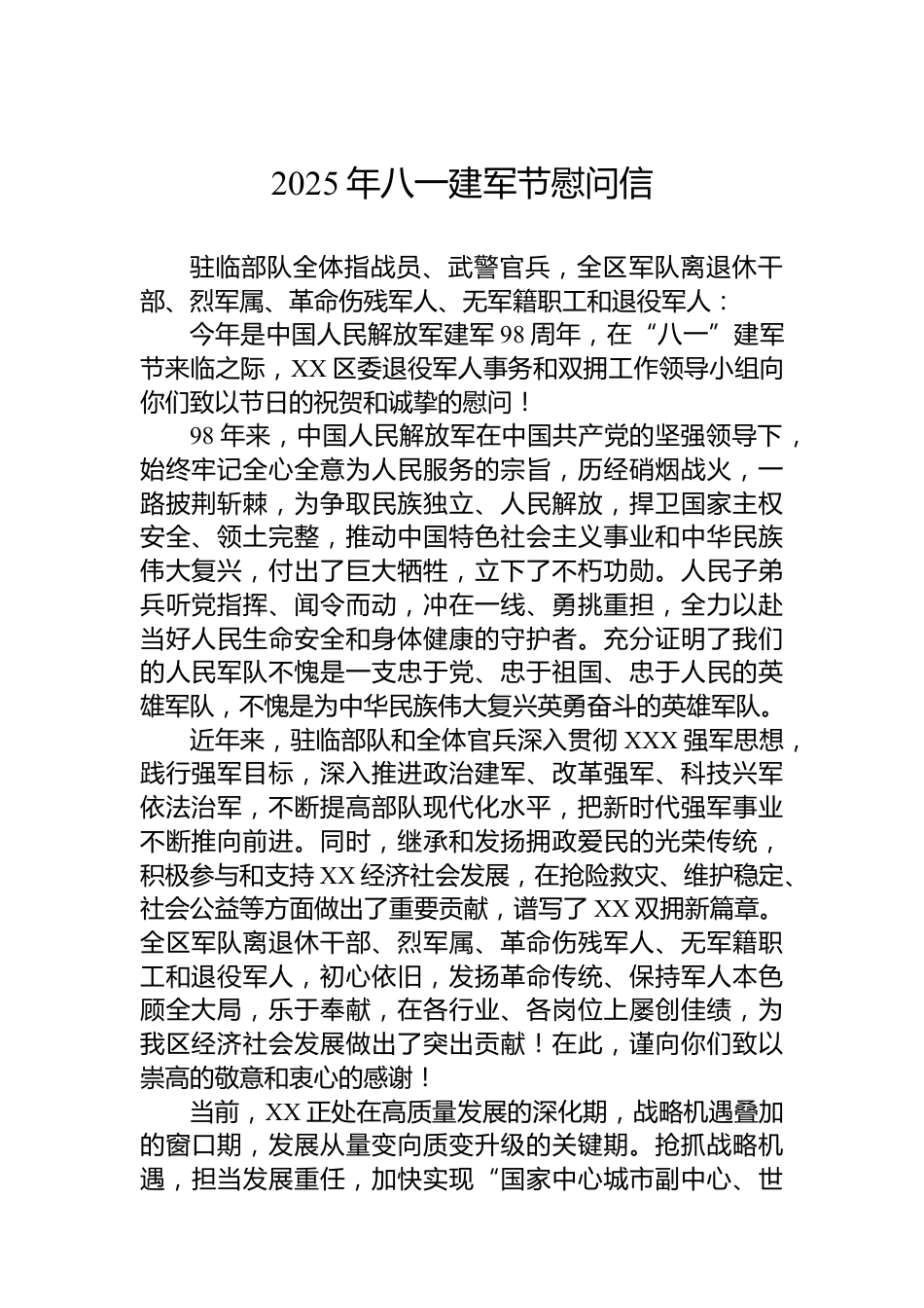2025年八一建軍節(jié)慰問信駐臨部隊(duì)全體指戰(zhàn)員、武警官兵,全區(qū)軍隊(duì)離退休干部、烈軍屬、革命傷殘軍人、無軍籍職工和退役軍人:今年是中國人民解放軍建軍98周年,在“八一”建軍節(jié)來臨之際,XX區(qū)委退役軍人事務(wù)和雙擁工作領(lǐng)導(dǎo)小組向你們致以節(jié)日的祝賀和誠摯的慰問!98年來,中國人民解放軍在中國共產(chǎn)黨的堅(jiān)強(qiáng)領(lǐng)導(dǎo)下,始終牢記全心全意為人民服務(wù)的宗旨,歷經(jīng)硝煙戰(zhàn)火,一路披荊斬棘,為爭(zhēng)取民族獨(dú)立、人民解放,捍衛(wèi)國家主權(quán)安全、領(lǐng)土完整,推動(dòng)中國特色社會(huì)主義事業(yè)和中華民族偉大復(fù)興,付出了巨大犧牲,立下了不朽功勛。人民子弟兵聽黨指揮、聞令而動(dòng),沖在一線、勇挑重...