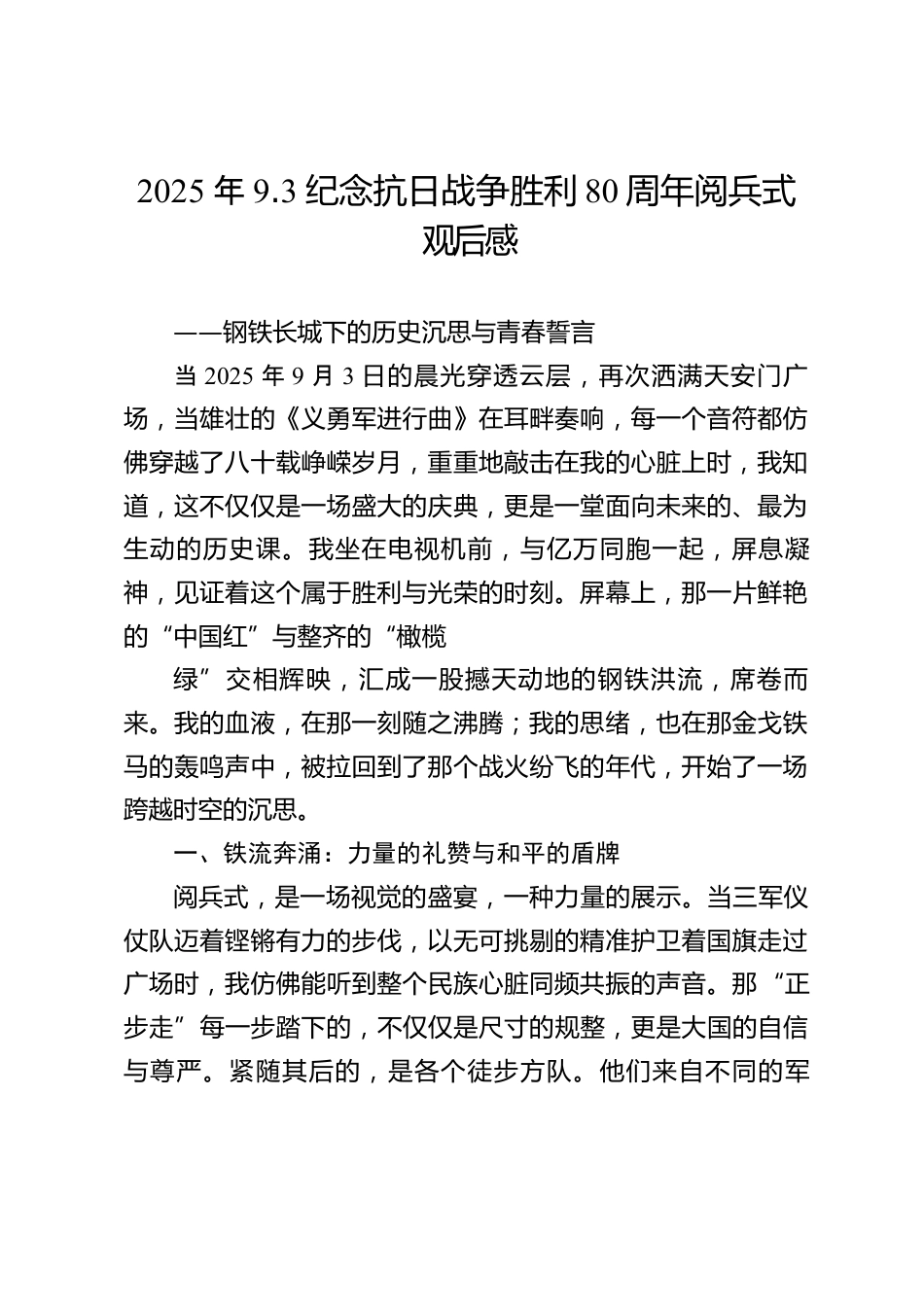 2025年9.3紀(jì)念抗日戰(zhàn)爭(zhēng)勝利80周年閱兵式觀后感——鋼鐵長(zhǎng)城下的歷史沉思與青春誓言當(dāng)2025年9月3日的晨光穿透云層,再次灑滿天安門(mén)廣場(chǎng),當(dāng)雄壯的《義勇軍進(jìn)行曲》在耳畔奏響,每一個(gè)音符都仿佛穿越了八十載崢嶸歲月,重重地敲擊在我的心臟上時(shí),我知道,這不僅僅是一場(chǎng)盛大的慶典,更是一堂面向未來(lái)的、最為生動(dòng)的歷史課。我坐在電視機(jī)前,與億萬(wàn)同胞一起,屏息凝神,見(jiàn)證著這個(gè)屬于勝利與光榮的時(shí)刻。屏幕上,那一片鮮艷的“中國(guó)紅”與整齊的“橄欖綠”交相輝映,匯成一股撼天動(dòng)地的鋼鐵洪流,席卷而來(lái)。我的血液,在那一刻隨之沸騰;我的思緒,也在那金戈鐵馬的轟鳴聲...