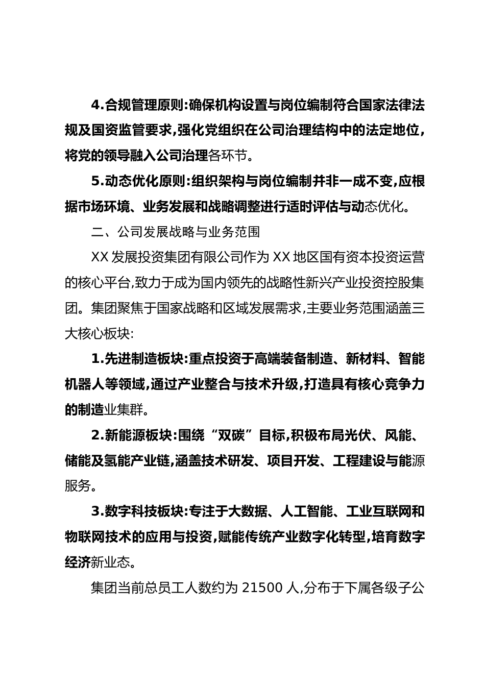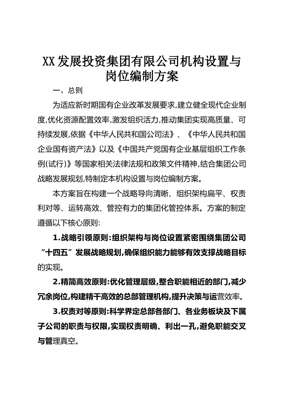 XX發(fā)展投資集團有限公司機構(gòu)設(shè)置與崗位編制方案一、總則為適應(yīng)新時期國有企業(yè)改革發(fā)展要求,建立健全現(xiàn)代企業(yè)制度,優(yōu)化資源配置效率,激發(fā)組織活力,推動集團實現(xiàn)高質(zhì)量、可持續(xù)發(fā)展,依據(jù)《中華人民共和國公司法》、《中華人民共和國企業(yè)國有資產(chǎn)法》以及《中國共產(chǎn)黨國有企業(yè)基層組織工作條例(試行)》等國家相關(guān)法律法規(guī)和政策文件精神,結(jié)合集團公司戰(zhàn)略發(fā)展規(guī)劃,特制定本機構(gòu)設(shè)置與崗位編制方案。本方案旨在構(gòu)建一個戰(zhàn)略導(dǎo)向清晰、組織架構(gòu)扁平、權(quán)責(zé)利對等、運轉(zhuǎn)高效、管控有力的集團化管控體系。方案的制定遵循以下核心原則:1.戰(zhàn)略引領(lǐng)原則:組織架構(gòu)與崗位設(shè)置緊密圍繞...