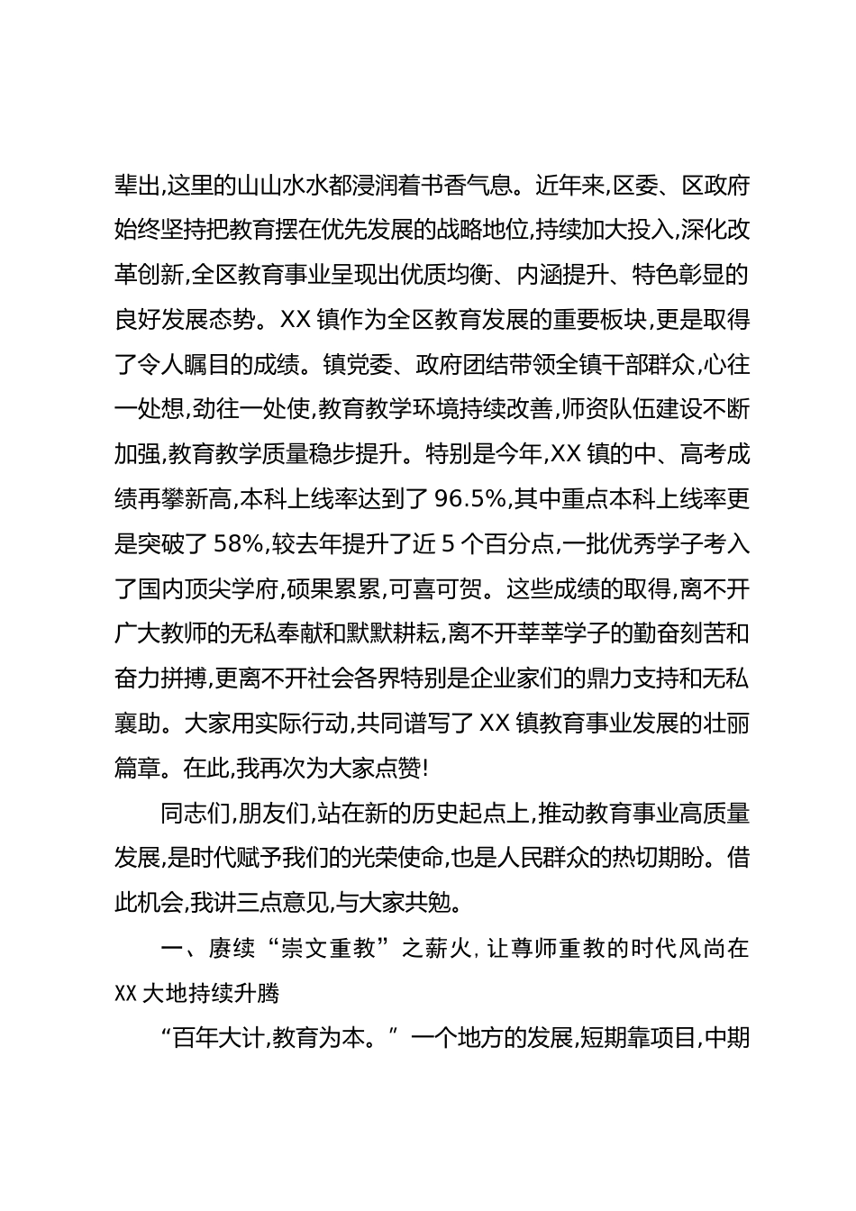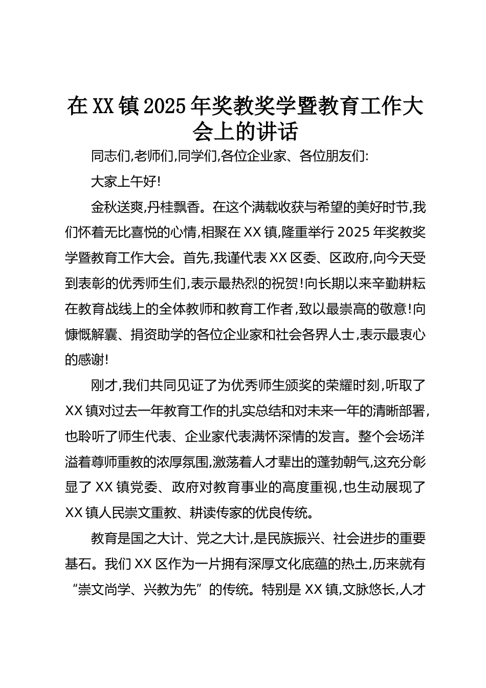 在XX鎮(zhèn)2025年獎(jiǎng)教獎(jiǎng)學(xué)暨教育工作大會(huì)上的講話同志們,老師們,同學(xué)們,各位企業(yè)家、各位朋友們:大家上午好!金秋送爽,丹桂飄香。在這個(gè)滿載收獲與希望的美好時(shí)節(jié),我們懷著無比喜悅的心情,相聚在XX鎮(zhèn),隆重舉行2025年獎(jiǎng)教獎(jiǎng)學(xué)暨教育工作大會(huì)。首先,我謹(jǐn)代表XX區(qū)委、區(qū)政府,向今天受到表彰的優(yōu)秀師生們,表示最熱烈的祝賀!向長(zhǎng)期以來辛勤耕耘在教育戰(zhàn)線上的全體教師和教育工作者,致以最崇高的敬意!向慷慨解囊、捐資助學(xué)的各位企業(yè)家和社會(huì)各界人士,表示最衷心的感謝!剛才,我們共同見證了為優(yōu)秀師生頒獎(jiǎng)的榮耀時(shí)刻,聽取了XX鎮(zhèn)對(duì)過去一年教育工作的扎實(shí)總結(jié)和對(duì)未來一年的清晰部署,...