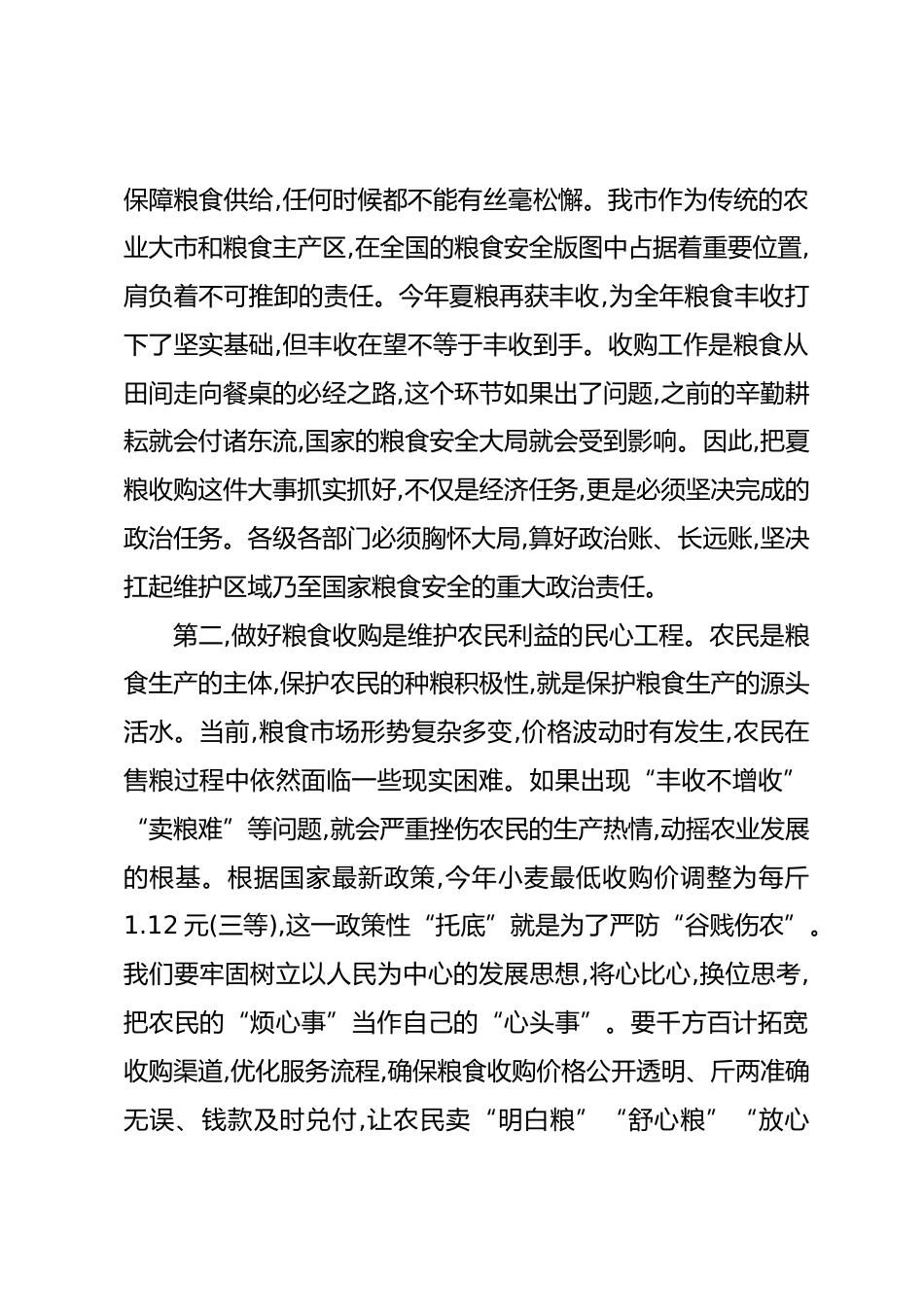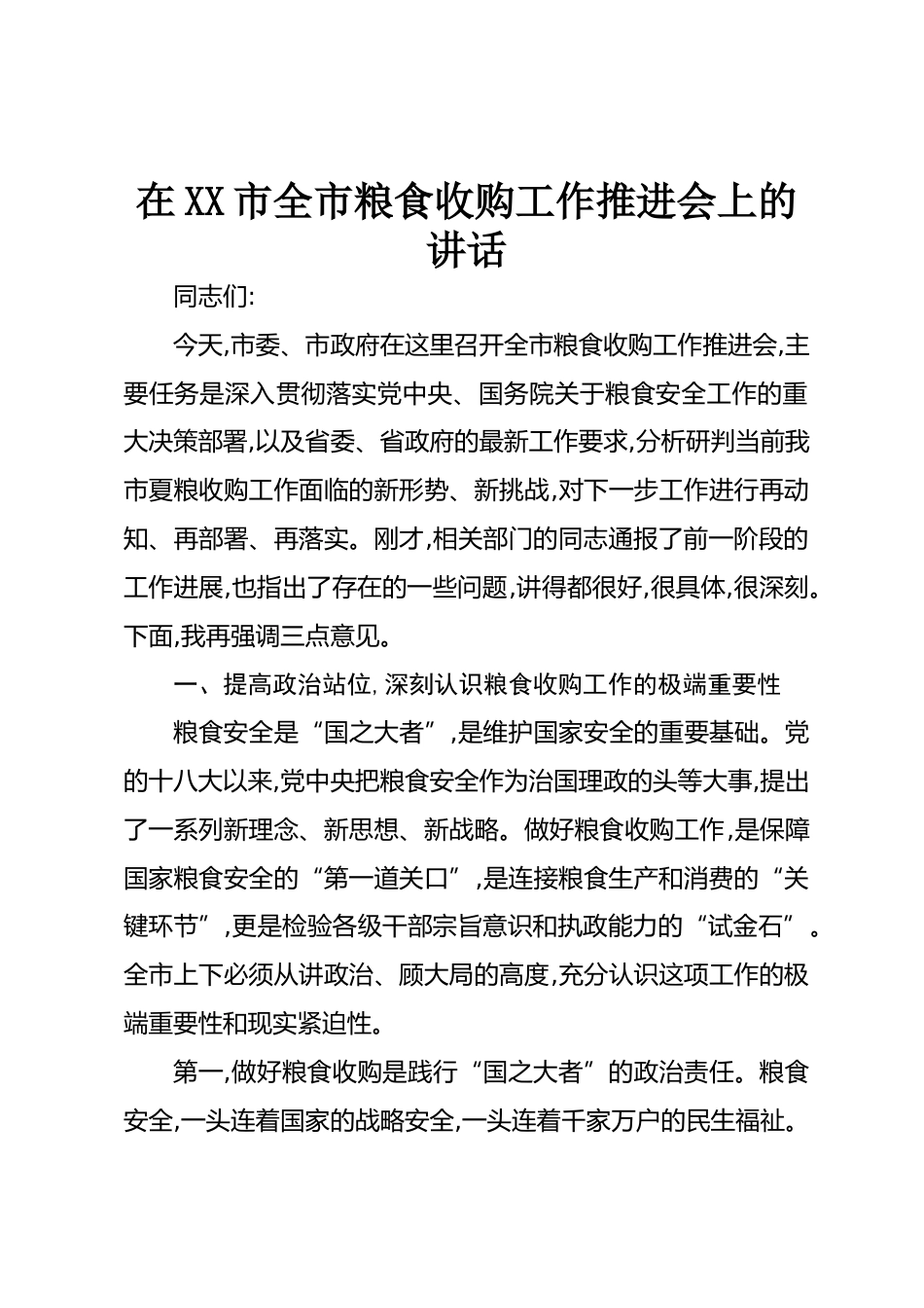 在XX市全市糧食收購工作推進(jìn)會上的講話同志們:今天,市委、市政府在這里召開全市糧食收購工作推進(jìn)會,主要任務(wù)是深入貫徹落實(shí)黨中央、國務(wù)院關(guān)于糧食安全工作的重大決策部署,以及省委、省政府的最新工作要求,分析研判當(dāng)前我市夏糧收購工作面臨的新形勢、新挑戰(zhàn),對下一步工作進(jìn)行再動知、再部署、再落實(shí)。剛才,相關(guān)部門的同志通報(bào)了前一階段的工作進(jìn)展,也指出了存在的一些問題,講得都很好,很具體,很深刻。下面,我再強(qiáng)調(diào)三點(diǎn)意見。一、提高政治站位,深刻認(rèn)識糧食收購工作的極端重要性糧食安全是“國之大者”,是維護(hù)國家安全的重要基礎(chǔ)。黨的十八大以來,黨中央把糧食安全作為...