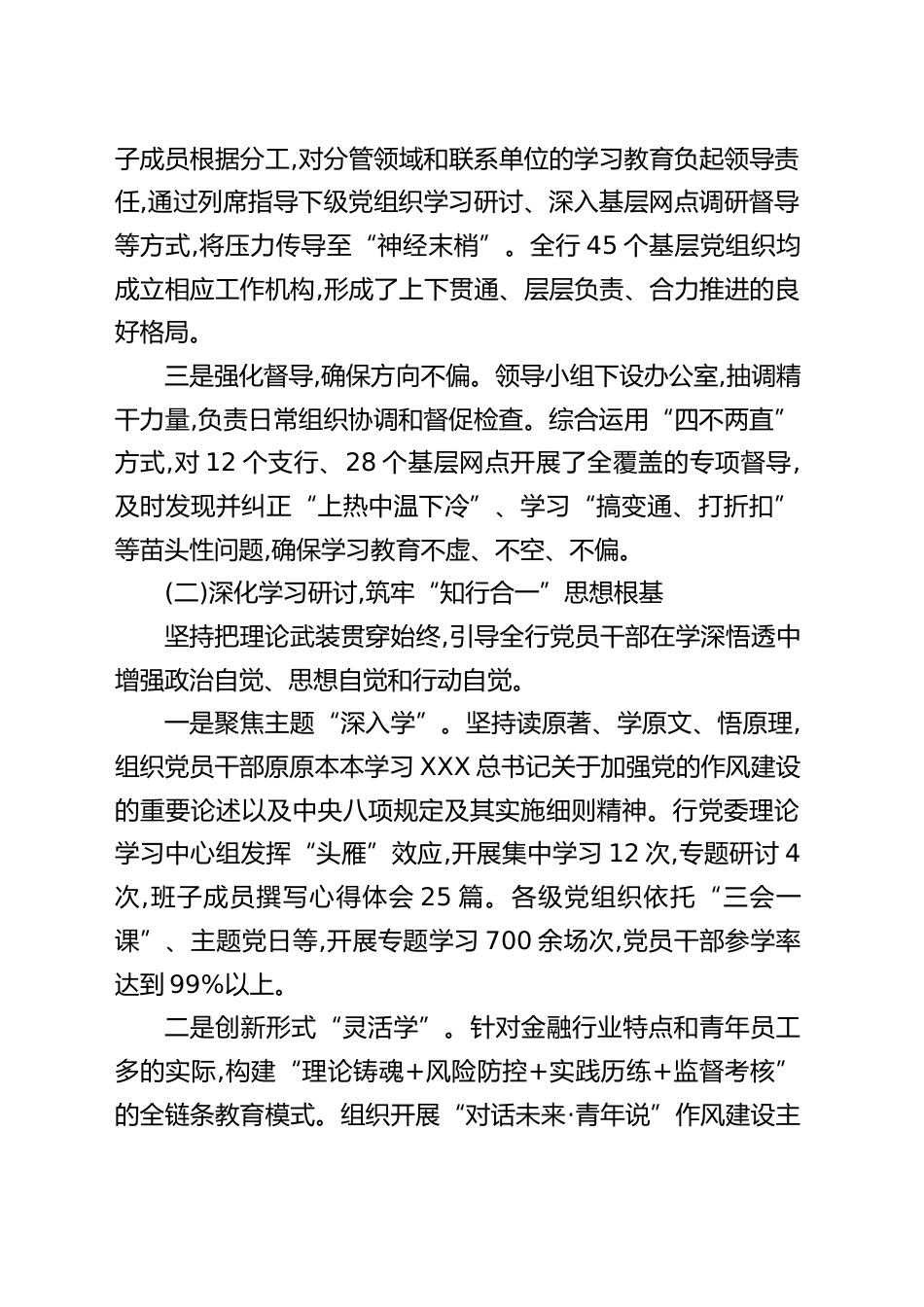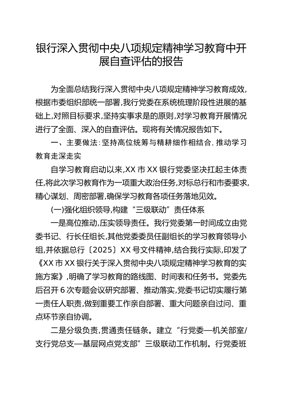 銀行深入貫徹中央八項(xiàng)規(guī)定精神學(xué)習(xí)教育中開展自查評(píng)估的報(bào)告為全面總結(jié)我行深入貫徹中央八項(xiàng)規(guī)定精神學(xué)習(xí)教育成效,根據(jù)市委組織部統(tǒng)一部署,我行黨委在系統(tǒng)梳理階段性進(jìn)展的基礎(chǔ)上,對(duì)照目標(biāo)要求,堅(jiān)持實(shí)事求是的原則,對(duì)學(xué)習(xí)教育開展情況進(jìn)行了全面、深入的自查評(píng)估?,F(xiàn)將有關(guān)情況報(bào)告如下。一、主要做法:堅(jiān)持高位統(tǒng)籌與精耕細(xì)作相結(jié)合,推動(dòng)學(xué)習(xí)教育走深走實(shí)自學(xué)習(xí)教育啟動(dòng)以來,XX市XX銀行黨委堅(jiān)決扛起主體責(zé)任,將此次學(xué)習(xí)教育作為一項(xiàng)重大政治任務(wù),對(duì)標(biāo)總行和市委要求,精心謀劃、周密部署,確保學(xué)習(xí)教育各項(xiàng)任務(wù)落地見效。(一)強(qiáng)化組織領(lǐng)導(dǎo),構(gòu)建“三級(jí)聯(lián)動(dòng)”責(zé)任體系一是高...