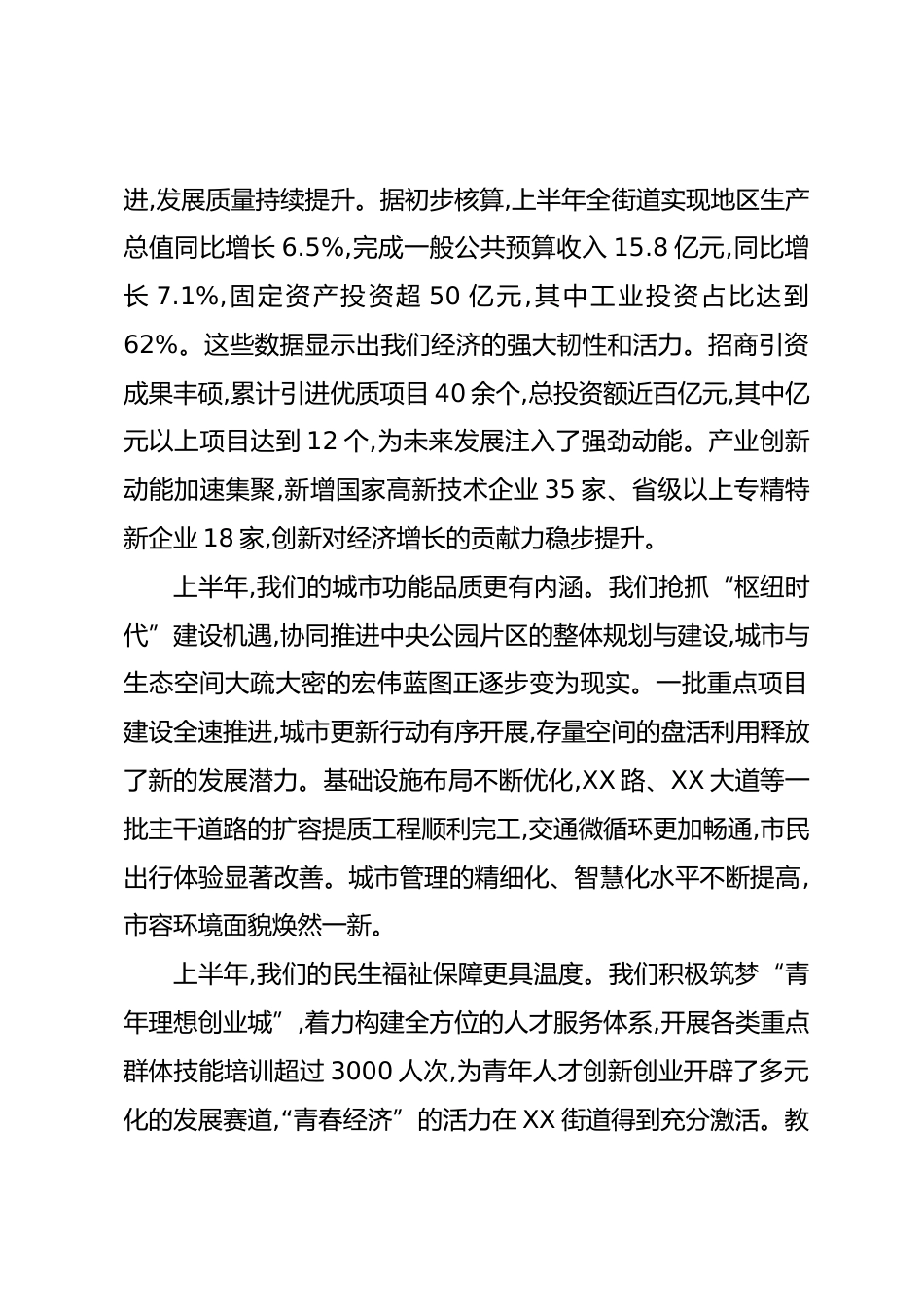 在XX街道二級干部(擴(kuò)大)會議暨下半年工作推進(jìn)會上的講話同志們:今天,我們在這里召開街道二級干部(擴(kuò)大)會議暨下半年工作推進(jìn)會,主要任務(wù)是深入學(xué)習(xí)貫徹黨的二十大和二十屆二中、三中全會精神,以及XXX總書記對XX省、XX市工作的重要講話精神,全面落實省、市、區(qū)委的各項決策部署。會議旨在系統(tǒng)回顧上半年工作,科學(xué)部署下半年任務(wù),動員街道上下進(jìn)一步統(tǒng)一思想、凝聚共識、堅定信心、扎實奮斗,確保圓滿完成全年經(jīng)濟(jì)社會發(fā)展目標(biāo),為“十四五”規(guī)劃勝利收官、“十五五”科學(xué)謀篇奠定堅實基礎(chǔ),切實展現(xiàn)我們作為經(jīng)濟(jì)強(qiáng)街的應(yīng)有擔(dān)當(dāng)和作為。下面,我講三點意見。一、肯定成績、正視...