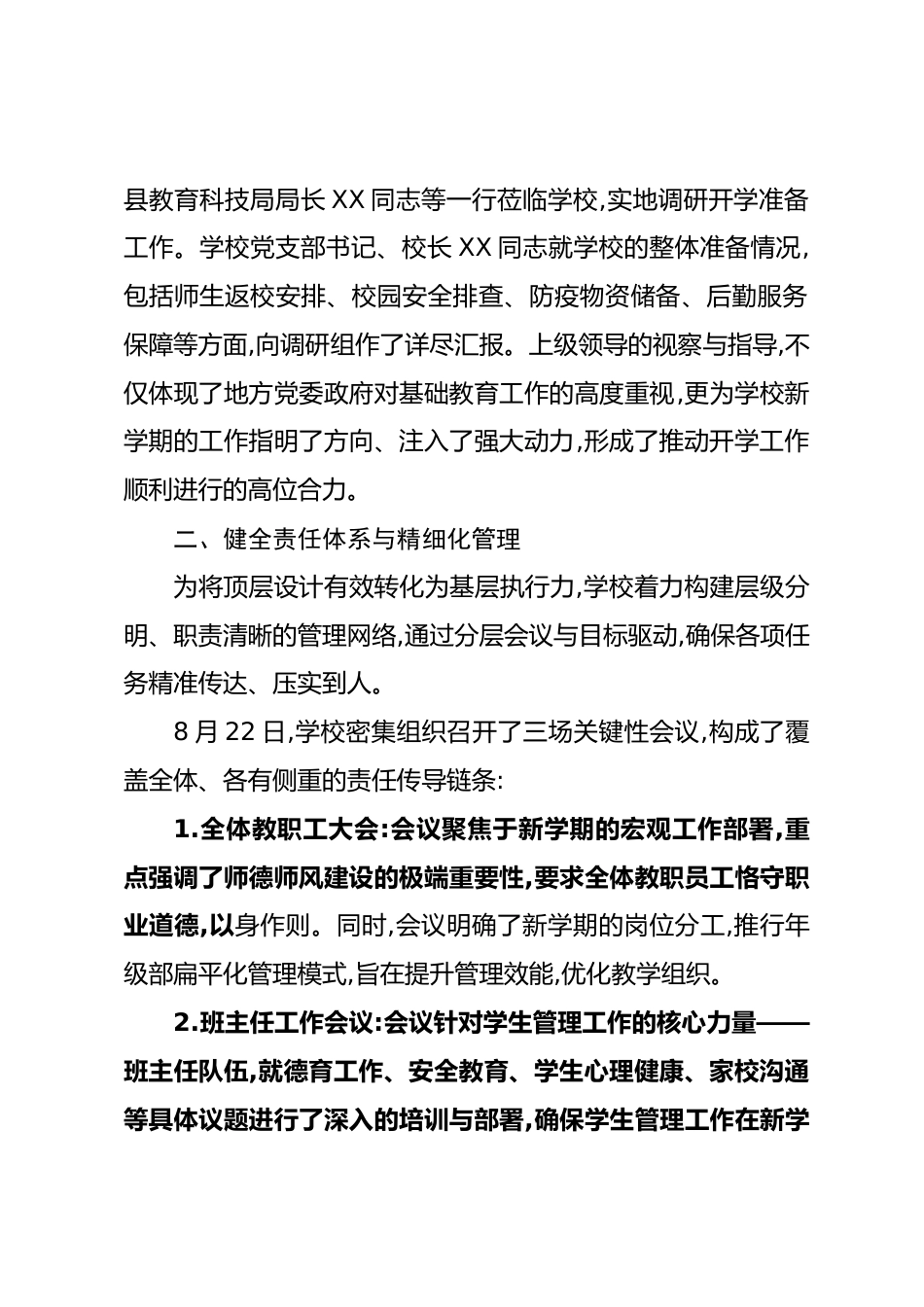 XX初級中學關于2025年秋季學期開學準備工作的綜合報告為確保2025年秋季學期各項工作實現平穩(wěn)過渡與良好開局,XX初級中學嚴格遵循上級教育主管部門的統(tǒng)一部署,以“平安開學、有序開學、溫馨開學”為核心目標,通過前瞻性謀劃、系統(tǒng)化部署與精細化執(zhí)行,全面、扎實地完成了開學前的各項準備工作。本報告旨在對本次開學準備工作的總體情況、關鍵舉措、實施成效及未來展望進行系統(tǒng)性梳理與總結。一、強化頂層設計與高位統(tǒng)籌教育工作的順利開展,離不開科學的頂層設計與強有力的組織領導。學期伊始,學校管理層深刻認識到開學準備工作的復雜性與重要性,堅持“謀定而后動”的原則,將...