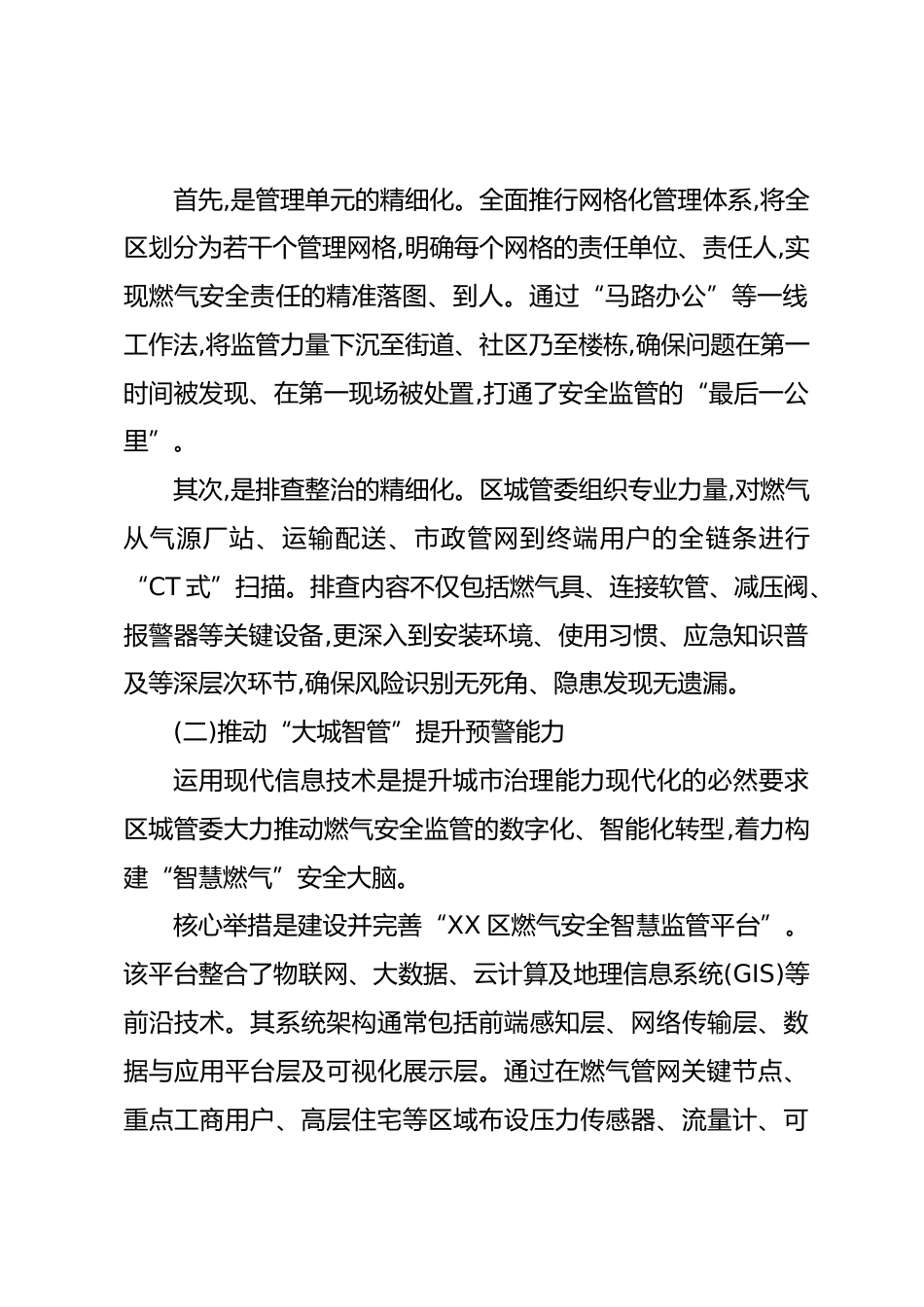 XX區(qū)城市管理委員會關(guān)于2022-2025年燃氣安全治理工作的專項報告燃氣安全是城市公共安全體系的關(guān)鍵組成部分,直接關(guān)系到人民群眾的生命財產(chǎn)安全與社會和諧穩(wěn)定。進入新發(fā)展階段,隨著城市化進程的持續(xù)深化和燃氣普及率的不斷提高,燃氣安全管理的復雜性與重要性日益凸顯。XX區(qū)城市管理委員會始終秉持以人民為中心的發(fā)展思想,將保障燃氣安全作為城市治理工作的重中之重。本報告旨在系統(tǒng)梳理與總結(jié)2022年以來,特別是“燃氣安全治本攻堅三年行動”啟動以來,區(qū)城管委在燃氣安全領(lǐng)域的治理理念、主要舉措、工作成效及長效機制建設(shè)情況,為持續(xù)提升我區(qū)燃氣安全保障水平提供決策參考...